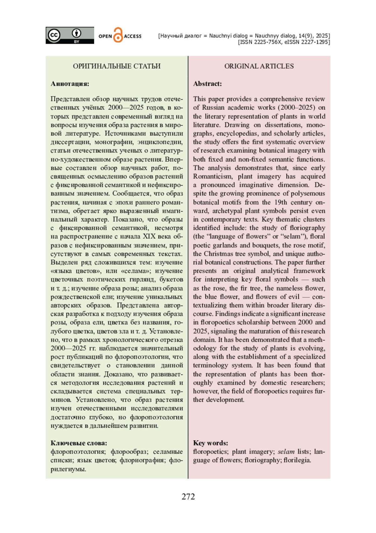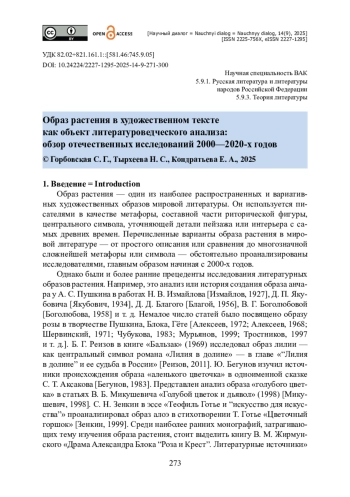 Представлен обзор научных трудов отечественных учёных 2000-2025 годов, в которых представлен современный взгляд на вопросы изучения образа растения в мировой литературе. Источниками выступили диссертации, монографии, энциклопедии, статьи отечественных ученых о литературно-художественном образе растения. Впервые составлен обзор научных работ, посвященных осмыслению образов растений с фиксированной семантикой и нефиксированным значением. Сообщается, что образ растения, начиная с эпохи раннего романтизма, обретает ярко выраженный имагинальный характер. Показано, что образы с фиксированной семантикой, несмотря на распространение с начала XIX века образов с нефиксированным значением, присутствуют в самых современных текстах. Выделен ряд сложившихся тем: изучение «языка цветов», или «селама»; изучение цветочных поэтических гирлянд, букетов и т. д.; изучение образа розы; анализ образа рождественской ели; изучение уникальных авторских образов. Представлена авторская разработка к подходу изучения образа розы, образа ели, цветка без названия, голубого цветка, цветов зла и т. д. Установлено, что в рамках хронологического отрезка 2000—2025 гг. наблюдается значительный рост публикаций по флоропоэтологии, что свидетельствует о становлении данной области знания. Доказано, что развивается методология исследования растений и складывается система специальных терминов. Установлено, что образ растения изучен отечественными исследователями достаточно глубоко, но флоропоэтология нуждается в дальнейшем развитии.