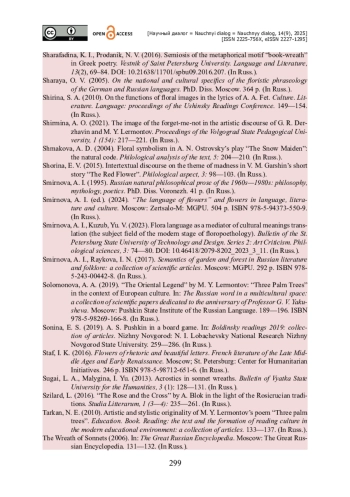 107. Шарафадина К. И. Семиозис метафорического мотива «книга-венок» в греческой поэзии / К. И. Шарафадина, Н. В. Проданик // Вестник Санкт-Петербургского университета. Язык и литература. - 2016. - №13(2). - C. 69 -84. - https://doi.org/10.21638/11701/spbu09.2016.207.
