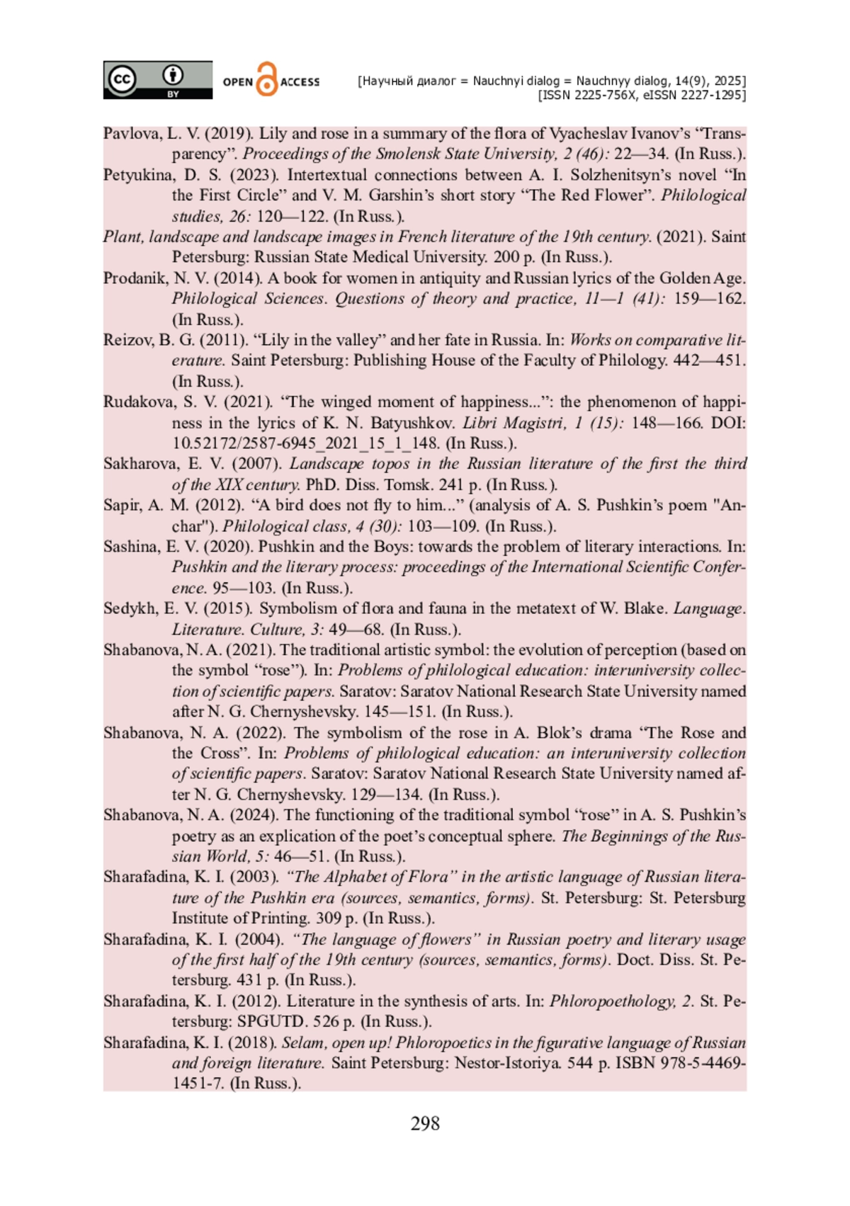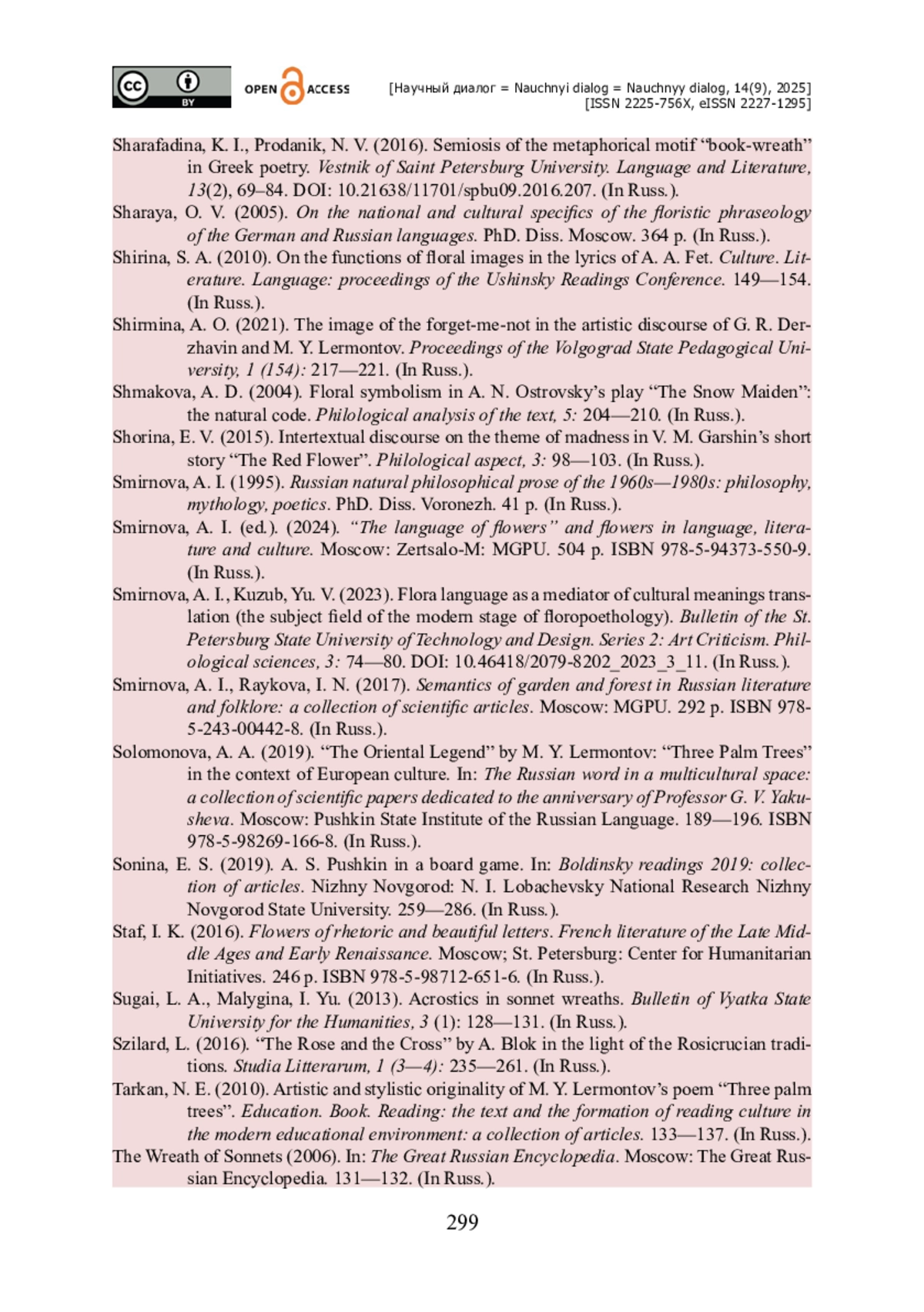 85. Смирнова А. И. Флороязык как медиатор трансляции культурных смыслов (предметное поле современного этапа флоропоэтологии) / А. И. Смирнова, Ю. В. Кузуб // Вестник Санкт-Петербургского государственного университета технологии и дизайна. Серия 2 : Искусствоведение. Филологические науки. - 2023. - № 3. - С. 74-80. - https://doi.org/10.46418/2079-8202_2023_3_11.