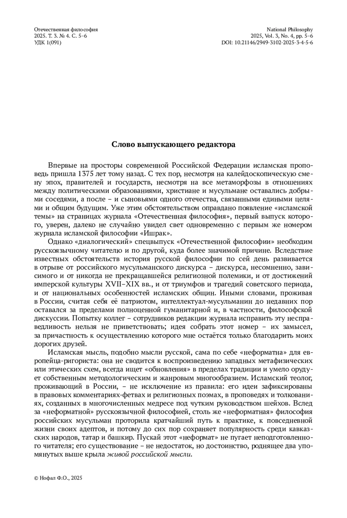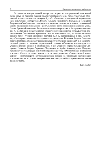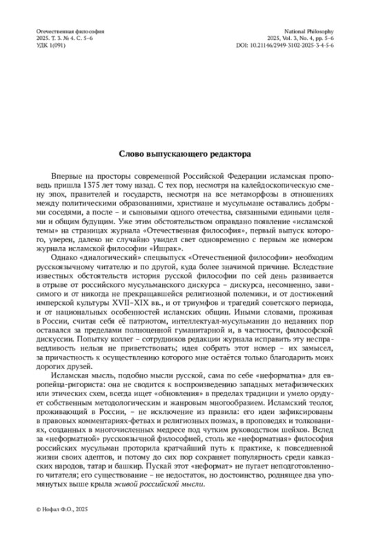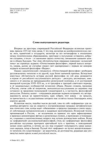 Впервые на просторы современной Российской Федерации исламская проповедь пришла 1375 лет тому назад. С тех пор, несмотря на калейдоскопическую смену эпох, правителей и государств, несмотря на все метаморфозы в отношениях между политическими образованиями, христиане и мусульмане оставались добрыми соседями, а после – и сыновьями одного отечества, связанными едиными целями и общим будущим. Уже этим обстоятельством оправдано появление «исламской темы» на страницах журнала «Отечественная философия», первый выпуск которого, уверен, далеко не случайно увидел свет одновременно с первым же номером журнала исламской философии «Ишрак».
