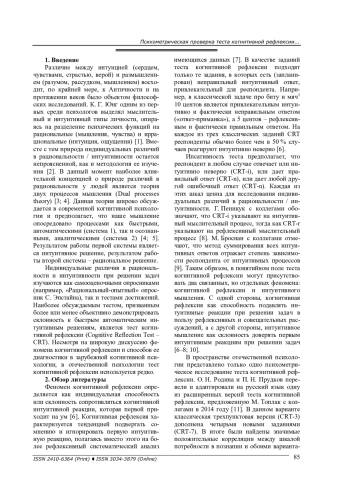 В статье представлены результаты проверки трудности, внутренней согласованности и надежности разных версий теста когнитивной рефлексии (CRT; С. Фредерик, М. Топлак, Р. Вест, К. Станович, К. Томсон, Д. Оппенгеймер). Данный ипсативный тест состоит из ряда заданий-головоломок, в логику которых вложено наличие импульсивного интуитивного неверного ответа, который первым приходит на ум. Чтобы правильно ответить на каждое из заданий, респонденту необходимо подавить первое интуитивное решение и, продолжив размышлять, прийти к правильному неочевидному решению. Таким образом, тест когнитивной рефлексии фиксирует три шкалы: когнитивная рефлексия (CRT-r), интуитивные ошибки (CRT-i) и неинтуитивные ошибки (CRT-n). Часть вопросов имеет числовой формат, а часть - вербальный (CRT-V). Общая выборка исследования составила 470 студентов, из них 22 % ( n = 102) мужчин и 78 % ( n = 368) женщин в возрасте 17-33 лет, учащихся разных среднеспециальных и высших учебных заведений города Перми. Анализ процента правильных, интуитивно неправильных и неправильных ответов выявил разную дискриминативность заданий теста. С помощью серии конфирматорных факторных анализов выявлено несколько однофакторных комплектов заданий с приемлемой согласованностью (отдельно для CRT-r и CRT-i). Надежность большинства версий комплектов заданий CRT находится на низком, но приемлемом уровне (наиболее высокие значения у CRT-r = ω Макдональдса до 0,778). Обсуждаются факты согласованности числовой и вербальной версии теста когнитивной рефлексии. Методика может быть использована для решения научных и прикладных задач как в психологии, так и других научных сферах.