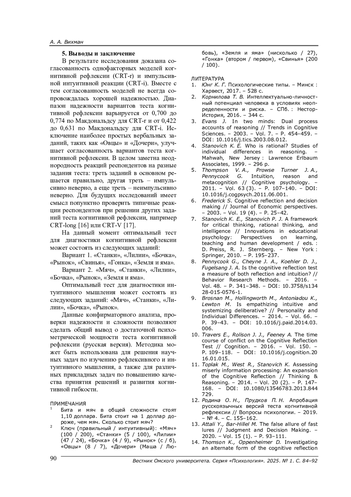5. Thompson V. A., Prowse Turner J. A., Pennycook G.Intuition, reason and metacognition // Cognitive psychology. - 2011. - Vol. 63 (3). - P. 107-140. -. DOI: 10.1016/j.cogpsych.2011.06.001