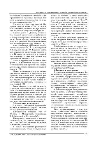 Представлены результаты исследования виртуальной и реальной идентичности юношей и девушек. В настоящее время широко распространена коммуникация в Интернете. Этим обусловлена актуальность углубленного изучения идентичностей, сформированных в Сети, у подрастающего поколения. В российской практике недостаточно раскрыт вопрос особенностей виртуальной и реальной идентичности у старших школьников. Целью исследования является изучение особенностей в представлениях о себе в реальном мире и пространстве Интернета у учащихся старшего звена. В нем приняли участие 56 учащихся лицея Казани в возрасте от 15 до 17 лет. Основной метод исследования - контент-анализ. При изучении идентичностей была выбрана методика открытого типа «Кто я?» (М. Кун, Т. Макпартленд; модификация В. В. Лазуриной) и «Кто я онлайн?». Результаты показали, что семейная идентичность оказалась преобладающей категорией самоопределения в реальной жизни, респонденты чаще всего описывали себя с позиции семейных отношений и ролей. Самой популярной категорией в ответах на вопрос «Кто я онлайн?» оказалась коммуникативная. Выраженность учебной, семейной и коммуникативной составляющих в структуре самоидентичности имеет статистические различия между реальным пространством учащихся и виртуальным. Ответы юношей и девушек по учебной и семейной идентичностям значимо чаще были даны относительно реального мира. Коммуникативная же идентичность, наоборот, статистически значимо чаще упомянута в виртуальной среде.