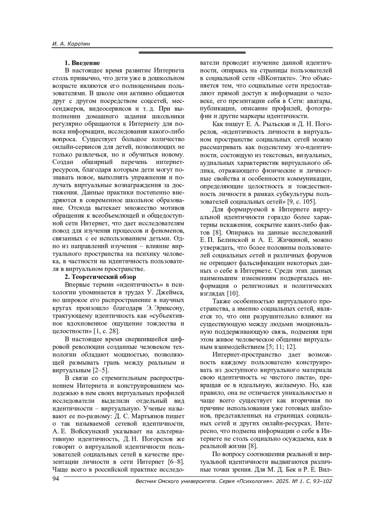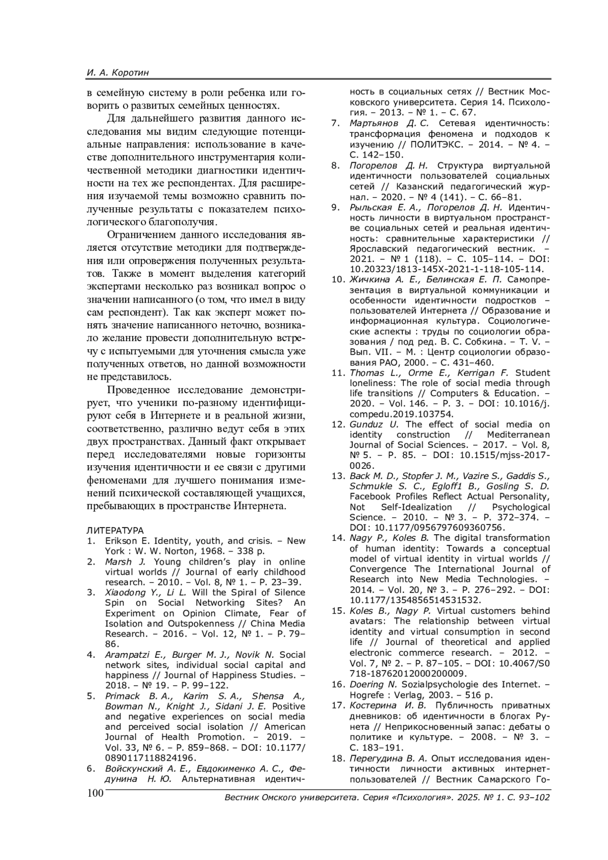 8. Погорелов Д. Н. Структура виртуальной идентичности пользователей социальных сетей // Казанский педагогический журнал. - 2020. - № 4 (141). - С. 66-81. EDN: OAYGPI