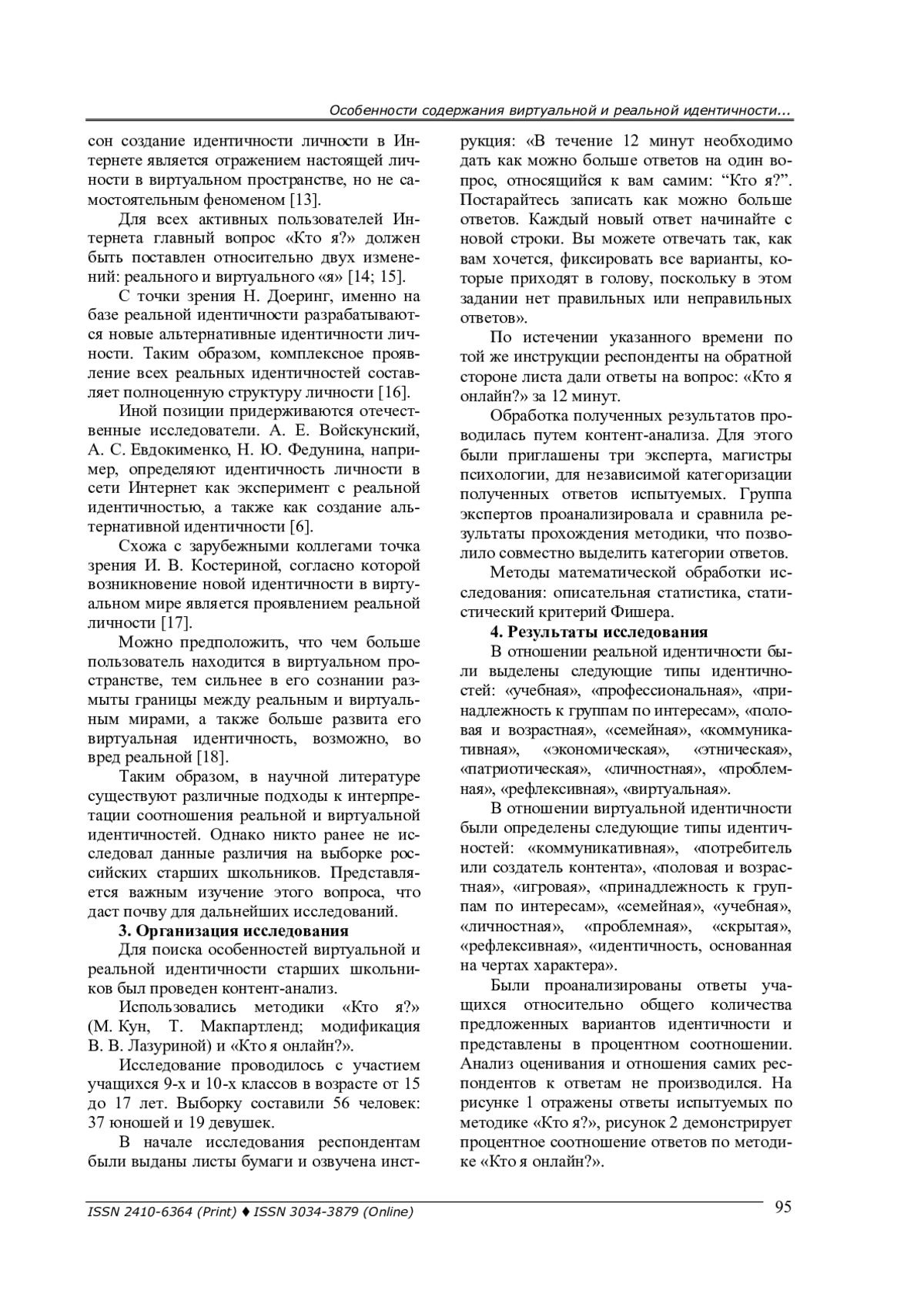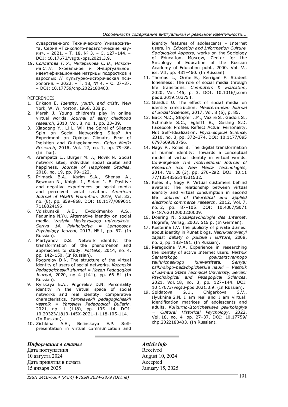 19. Солдатова Г. У., Чигарькова С. В., Илюхина С. Н. Я-реальное и Я-виртуальное: идентификационные матрицы подростков и взрослых // Культурно-историческая психология. - 2022. - Т. 18, № 4. - C. 27-37. -. DOI: 10.17759/chp.2022180403 EDN: GNSBWF