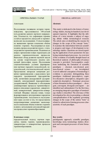 Исследование посвящено истории терминоведения, прослеживается 100-летний путь развития данного научного направления. Отмечается, что дефиниция термина остаётся предметом дискуссий в терминоведческих исследованиях. Статья посвящена выявлению причин изменения объёма понятия «термин». Рассматривается взаимосвязь процессов развития науки с этапами развития терминоведения. Поднимается вопрос применения новых параметров для анализа терминологических процессов. Выполнен обзор развития научной мысли на основе теоретического анализа концепций философии науки. Исследованы социокогнитивные условия формирования научных парадигм (классической, неклассической, постнеклассической науки). Представлена авторская концепция развития терминоведения с выделением трех парадигм: традиционной (прескриптивной), когнитивно-дискурсивной (дескриптивной), интегративной (прескриптивно-дескриптивной). Выявлены и обоснованы доминирующие процессы терминообразования в описанных парадигмах: дивергентный, конвергентный, дивергентно-конвергентный. Впервые описана новая, только формирующаяся интегративная парадигма терминоведения. Актуальность исследования также состоит в том, что представлена непротиворечивая концепция закономерности изменения объёма понятия «термин» в связи с актуальными для каждой парадигмы процессами терминообразования.
