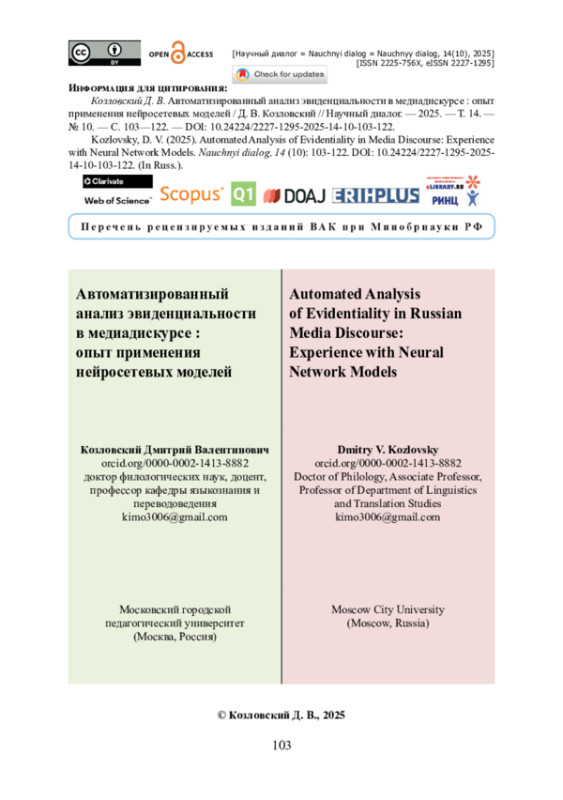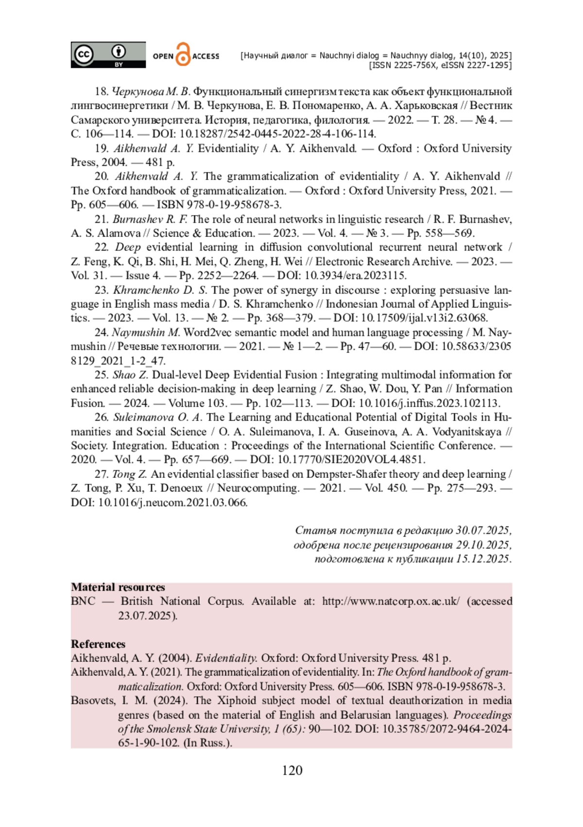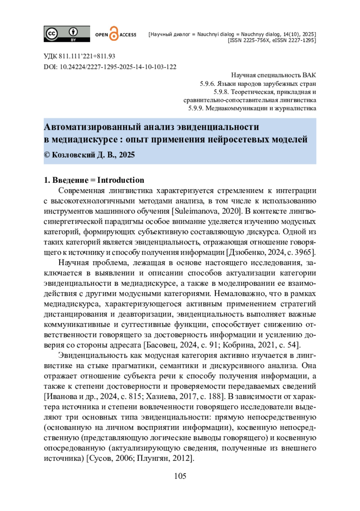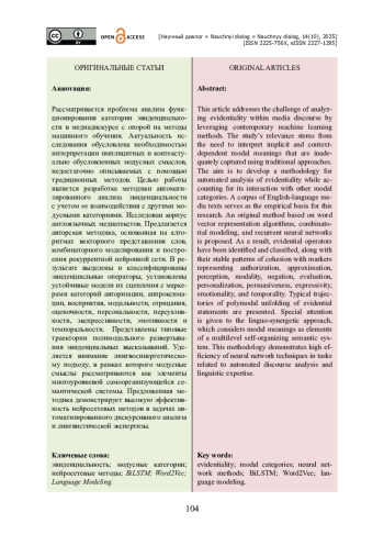 Рассматривается проблема анализа функционирования категории эвиденциальности в медиадискурсе с опорой на методы машинного обучения. Актуальность исследования обусловлена необходимостью интерпретации имплицитных и контекстуально обусловленных модусных смыслов, недостаточно описываемых с помощью традиционных методов. Целью работы является разработка методики автоматизированного анализа эвиденциальности с учетом ее взаимодействия с другими модусными категориями. Исследован корпус англоязычных медиатекстов. Предлагается авторская методика, основанная на алгоритмах векторного представления слов, комбинаторного моделирования и построения рекуррентной нейронной сети. В результате выделены и классифицированы эвиденциальные операторы, установлены устойчивые модели их сцепления с маркерами категорий авторизации, аппроксимации, восприятия, модальности, отрицания, оценочности, персональности, персуазивности, экспрессивности, эмотивности и темпоральности. Представлены типовые траектории полимодального развертывания эвиденциальных высказываний. Уделяется внимание лингвосинергетическому подходу, в рамках которого модусные смыслы рассматриваются как элементы многоуровневой самоорганизующейся семантической системы. Предложенная методика демонстрирует высокую эффективность нейросетевых методов в задачах автоматизированного дискурсивного анализа и лингвистической экспертизы.