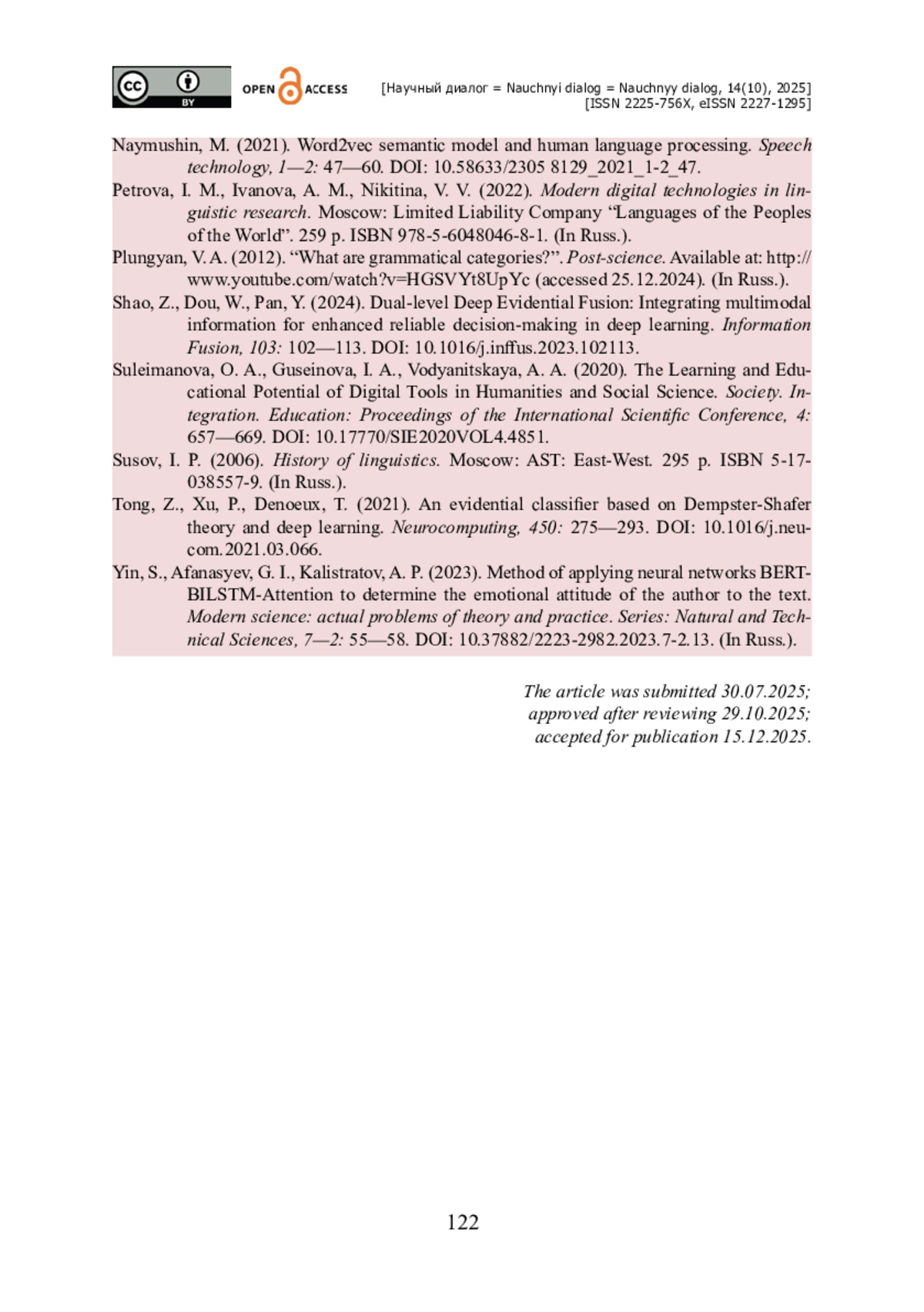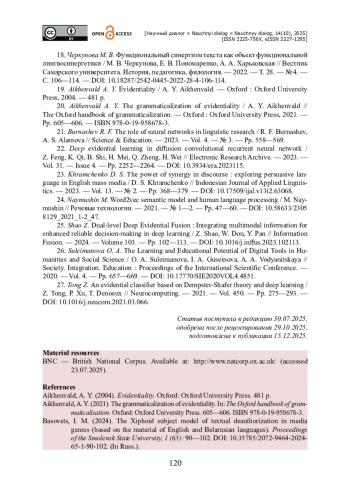 21. Burnashev R. F. The role of neural networks in linguistic research / R. F. Burnashev, A. S. Alamova // Science & Education. - 2023. - Vol. 4. - № 3. - Pp. 558-569.