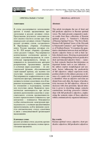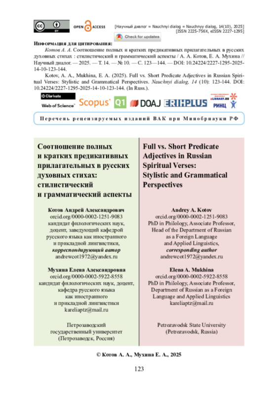 В статье рассматривается использование кратких и полных предикативных прилагательных в русских духовных стихах. Представлены результаты сопоставительного анализа текстов в составе трех сборников русских духовных стихов: Сборника русских духовных стихов, составленного В. Варенцовым; сборника «Голубиная книга: Русские народные духовные стихи XI—XIX веков»; сборника «Духовные стихи русского Севера». Рассматривается количественное соотношение кратких и полных адъективов-предикатов, их стилистическая маркированность. Авторы основываются на грамматическом критерии разграничения предикативных кратких и усеченных форм адъективов — их синтаксической функции, обусловливающей такой важный признак, как наличие или отсутствие падежного словоизменения. Рассматриваются морфологические и синтаксические факторы, влияющие на предикативность полных адъективов: способ выражения подлежащего, позиция адъектива по отношению к подлежащему, наличие или отсутствие связки. Выявляется грамматическая закономерность: при дистанционном расположении адъектива и существительного «степень предикативности» полного прилагательного повышается, при контактном — понижается. Описываются особые синтаксические «конструкции принадлежности» с полными предикативными прилагательными, особое внимание уделяется синтаксическому статусу адъективов в связи с коммуникативной организацией высказывания.