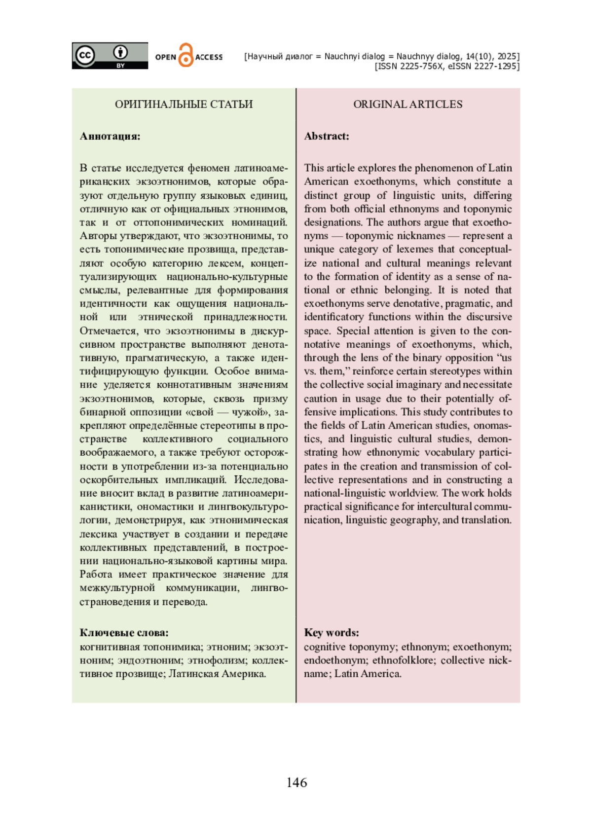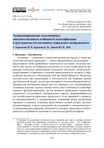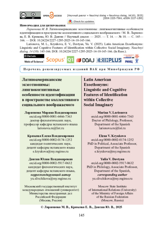 В статье исследуется феномен латиноамериканских экзоэтнонимов, которые образуют отдельную группу языковых единиц, отличную как от официальных этнонимов, так и от оттопонимических номинаций. Авторы утверждают, что экзоэтнонимы, то есть топонимические прозвища, представляют особую категорию лексем, концептуализирующих национально-культурные смыслы, релевантные для формирования идентичности как ощущения национальной или этнической принадлежности. Отмечается, что экзоэтнонимы в дискурсивном пространстве выполняют денотативную, прагматическую, а также идентифицирующую функции. Особое внимание уделяется коннотативным значениям экзоэтнонимов, которые, сквозь призму бинарной оппозиции «свой — чужой», закрепляют определённые стереотипы в пространстве коллективного социального воображаемого, а также требуют осторожности в употреблении из-за потенциально оскорбительных импликаций. Исследование вносит вклад в развитие латиноамериканистики, ономастики и лингвокультурологии, демонстрируя, как этнонимическая лексика участвует в создании и передаче коллективных представлений, в построении национально-языковой картины мира. Работа имеет практическое значение для межкультурной коммуникации, лингвострановедения и перевода.