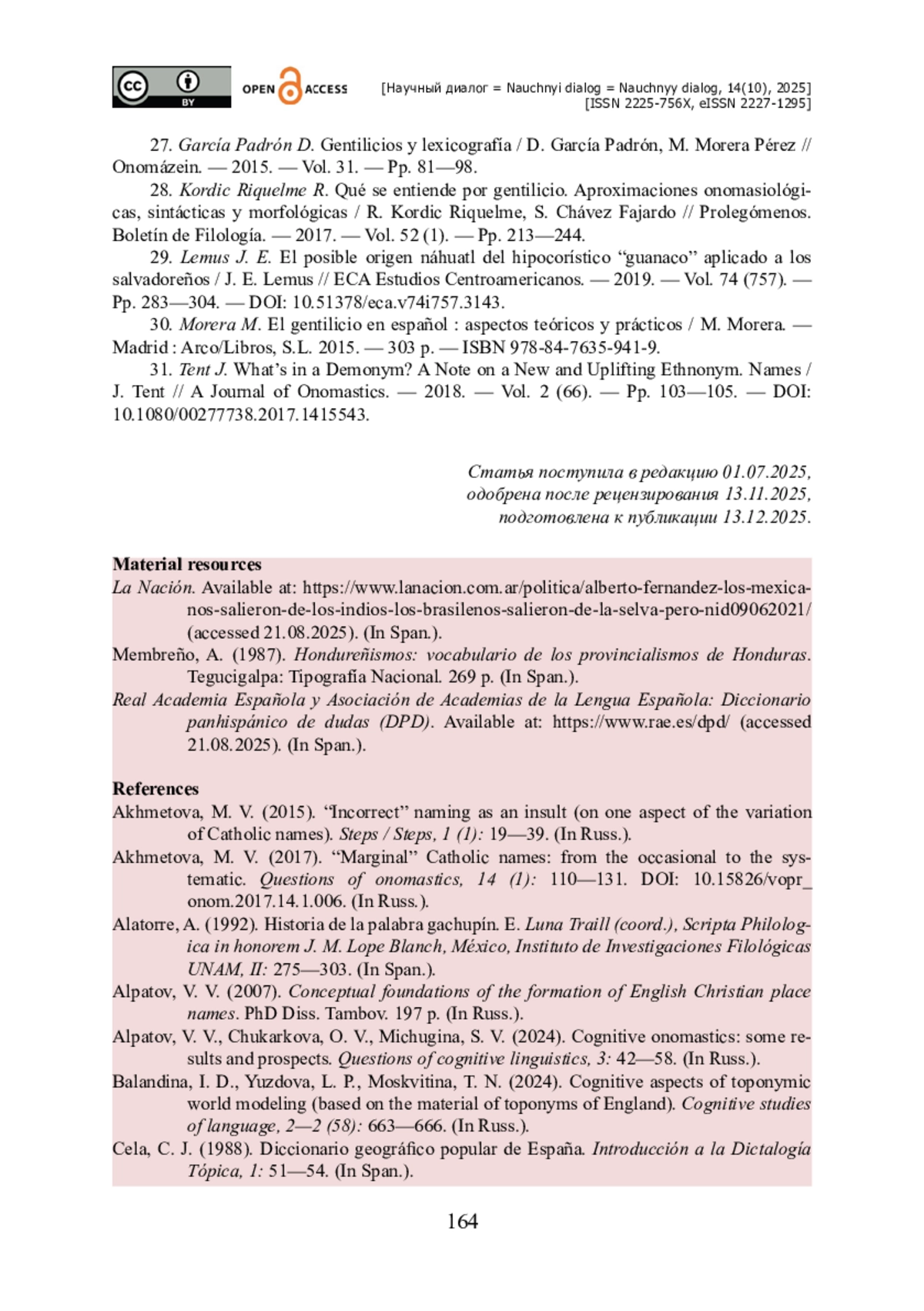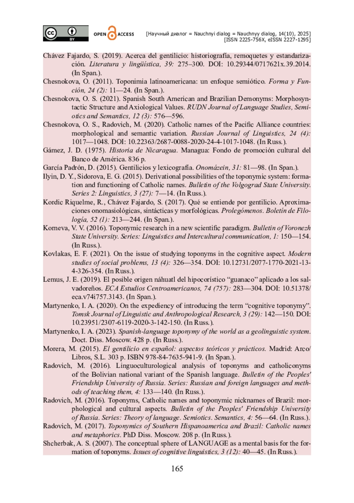 25. Chesnokova O. S. Spanish South American and Brazilian Demonyms : Morphosyntactic Structure and Axiological Values / O. S. Chesnokova, M. Radović, I. B. Kotenyatkina // RUDN Journal of Language Studies, Semiotics and Semantics. - 2021. - Vol. 12. - № 3. - Pp. 576-596.