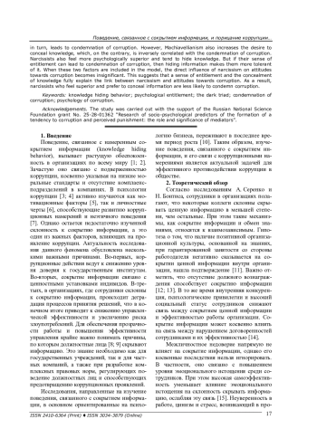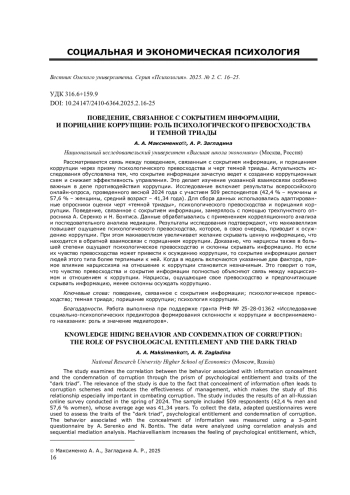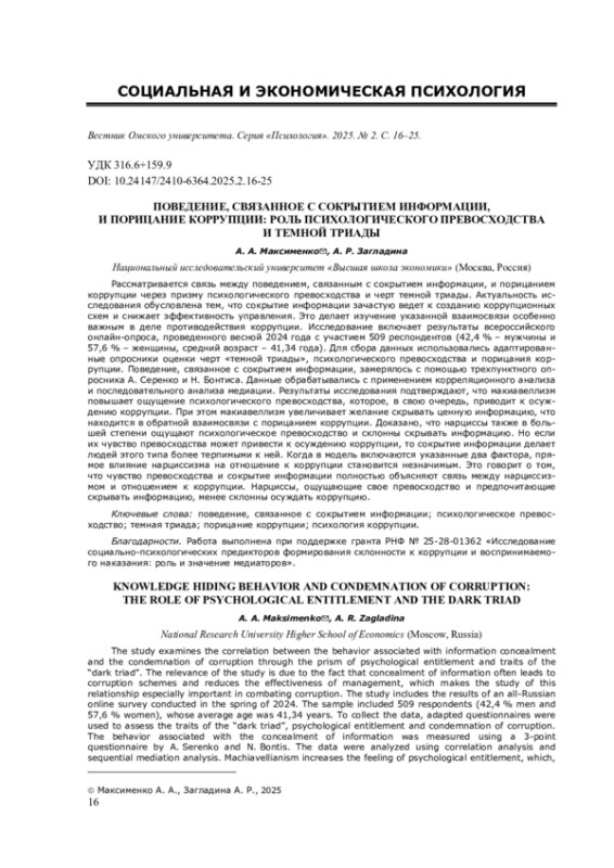 Рассматривается связь между поведением, связанным с сокрытием информации, и порицанием коррупции через призму психологического превосходства и черт темной триады. Актуальность исследования обусловлена тем, что сокрытие информации зачастую ведет к созданию коррупционных схем и снижает эффективность управления. Это делает изучение указанной взаимосвязи особенно важным в деле противодействия коррупции. Исследование включает результаты всероссийского онлайн-опроса, проведенного весной 2024 года с участием 509 респондентов (42,4 % - мужчины и 57,6 % - женщины, средний возраст - 41,34 года). Для сбора данных использовались адаптированные опросники оценки черт «темной триады», психологического превосходства и порицания коррупции. Поведение, связанное с сокрытием информации, замерялось с помощью трехпунктного опросника А. Серенко и Н. Бонтиса. Данные обрабатывались с применением корреляционного анализа и последовательного анализа медиации. Результаты исследования подтверждают, что макиавеллизм повышает ощущение психологического превосходства, которое, в свою очередь, приводит к осуждению коррупции. При этом макиавеллизм увеличивает желание скрывать ценную информацию, что находится в обратной взаимосвязи с порицанием коррупции. Доказано, что нарциссы также в большей степени ощущают психологическое превосходство и склонны скрывать информацию. Но если их чувство превосходства может привести к осуждению коррупции, то сокрытие информации делает людей этого типа более терпимыми к ней. Когда в модель включаются указанные два фактора, прямое влияние нарциссизма на отношение к коррупции становится незначимым. Это говорит о том, что чувство превосходства и сокрытие информации полностью объясняют связь между нарциссизмом и отношением к коррупции. Нарциссы, ощущающие свое превосходство и предпочитающие скрывать информацию, менее склонны осуждать коррупцию.