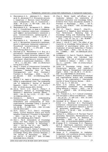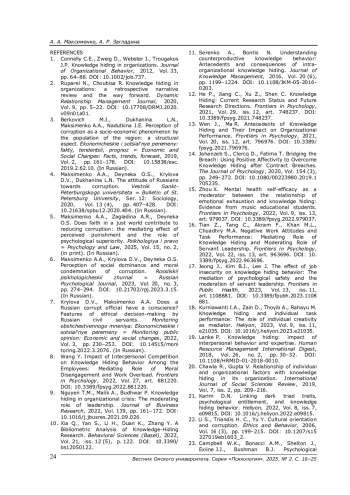 12. He P., Jiang C., Xu Z., Shen C. Knowledge Hiding: Current Research Status and Future Research Directions // Frontiers in Psychology. - 2021. - Vol. 29, Iss. 12. - Art. 748237. -. DOI: 10.3389/fpsyg.2021.748237 EDN: VWYIFO