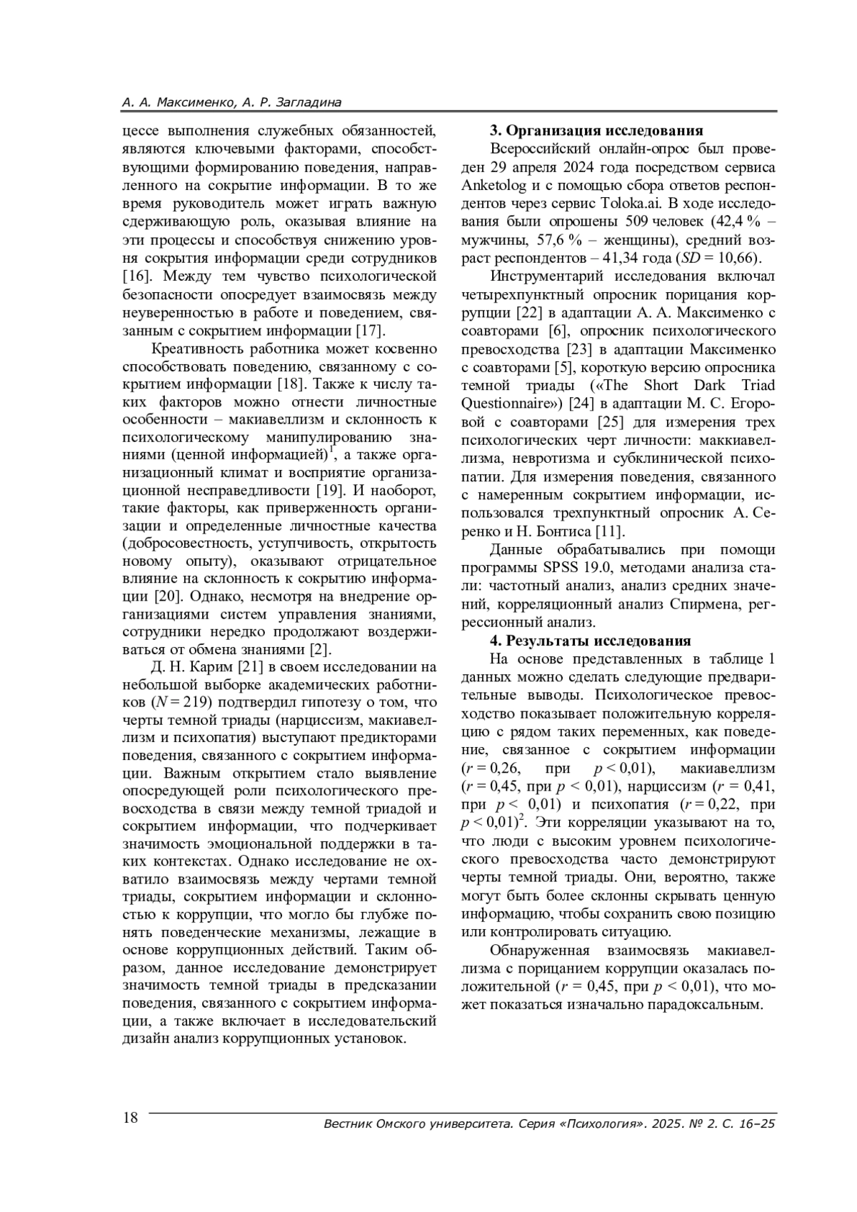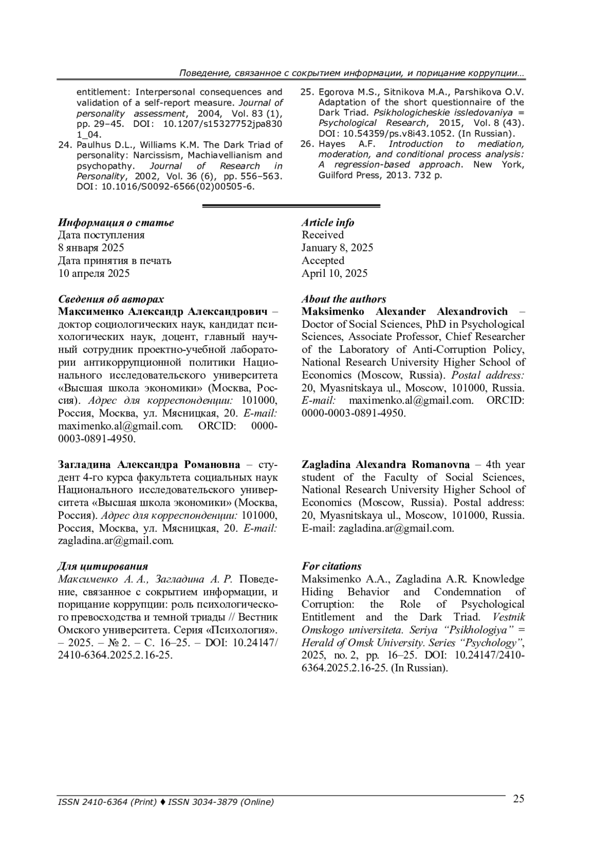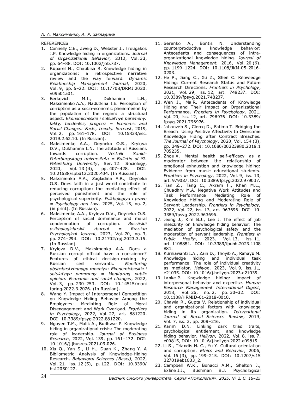 5. Максименко А. А., Загладина А. Р., Дейнека О. С. Способствует ли вера в справедливый мир снижению коррупции: опосредующий эффект воспринимаемого наказания и роль психологического превосходства // Психология и право. - 2025. - Т. 15, № 2. - (В печати).