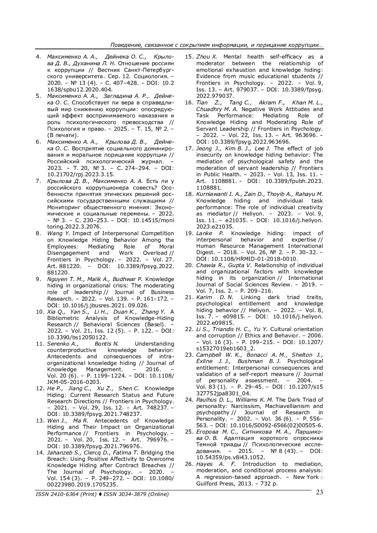 21. Karim D. N. Linking dark triad traits, psychological entitlement and knowledge hiding behavior // Heliyon. - 2022. - Vol. 8, Iss. 7. - e09815. - 10.1016/j.heliyon. 2022.e09815. DOI: 10.1016/j.heliyon.2022.e09815 EDN: THDELW
