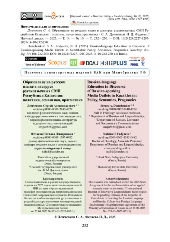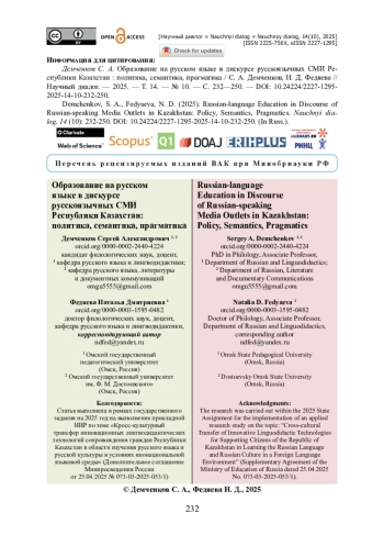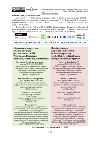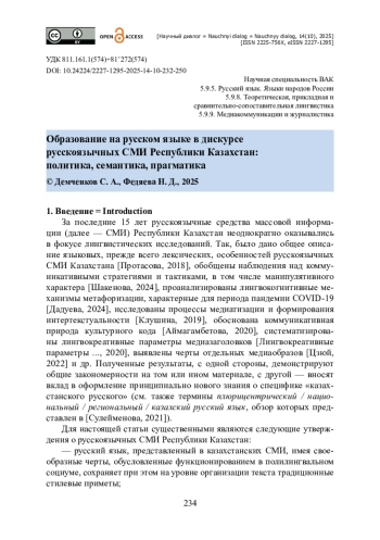 В статье представлены результаты анализа публикаций новостного портала «Zakon. kz» об образовании на русском языке в Республике Казахстан. Предлагается методика, включающая статистический, семантический, контекстуальный и контент-анализ публикаций. Новизна подхода заключается во внимании к социальному концепту ОБРАЗОВАНИЕ НА РУССКОМ ЯЗЫКЕ. Подчеркивается, что обнаруженные в текстах смысловые доминанты отражают состояние политики трехъязычия на различных этапах (2015—2018 годы, 2018—2022 годы, 2023 — настоящее время). Приводятся данные об оценочном характере публикаций. Подчеркнутая нейтральность публикаций противопоставляется приемам имплицитного выражения оценки триады языков: казахского, русского и английского. Показано, что такими приемами являются лексические замены, последовательность компонентов в ряду однородных определений, эвфемизация, смешение абсолютных и относительных количественных показателей. Установлено, что распределение публикаций по годам ожидаемо демонстрирует влияние социально-политического контекста: (1) всплеск интереса к проблематике русскоязычного образования в Казахстане в период с 2015 по 2018 годы связан с принятием государственной концепции трёхъязычного образования на 2015—2020 годы, (2) активизация медиа в период с 2023 года по настоящее время объясняется актуализацией вопроса о статусе русского языка как языка международного общения в современных геополитических условиях.
