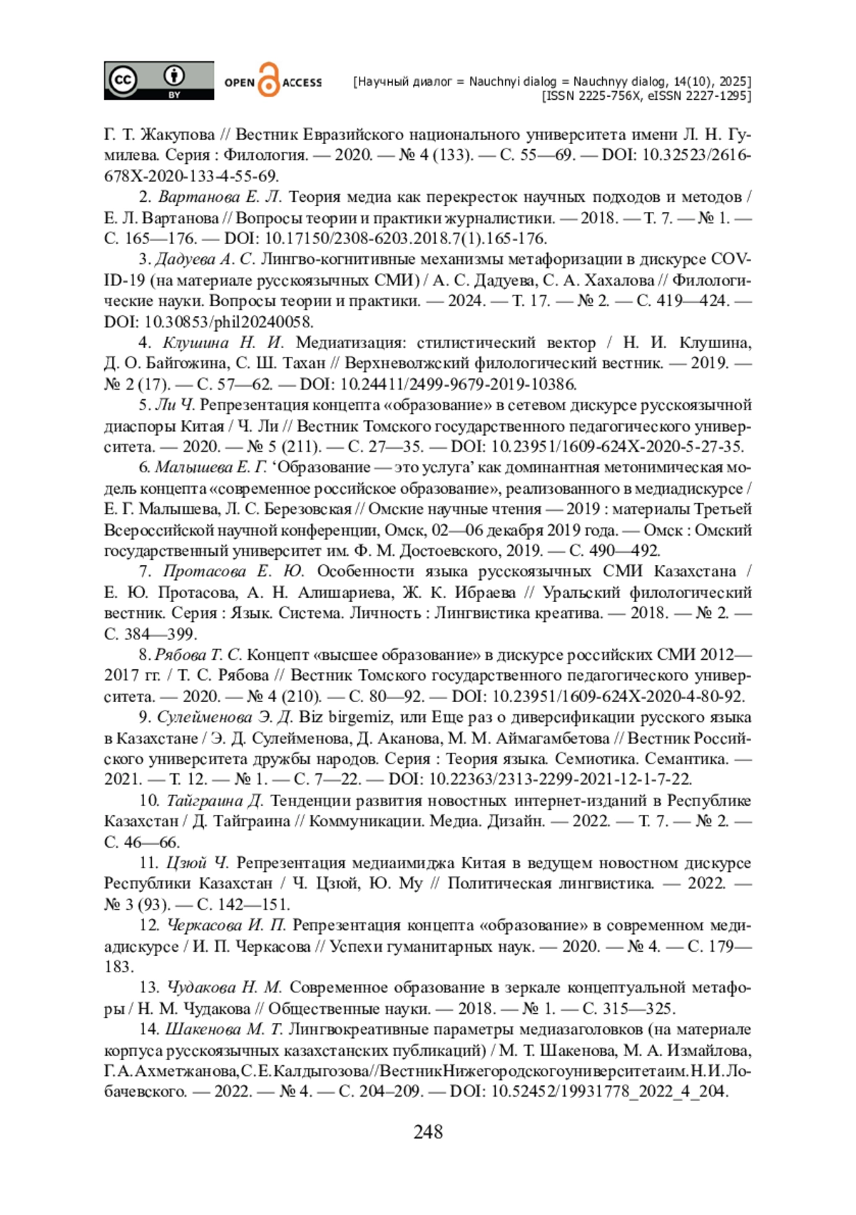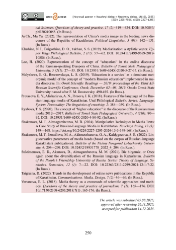 14. Шакенова М. Т. Лингвокреативные параметры медиазаголовков (на материале корпуса русскоязычных казахстанских публикаций) / М. Т. Шакенова, М. А. Измайлова, Г. А. Ахметжанова, С. Е. Калдыгозова // Вестник Нижегородского университета им. Н. И. Лобачевского. - 2022. - № 4. - С. 204-209. - https://doi.org/10.52452/19931778_2022_4_204.