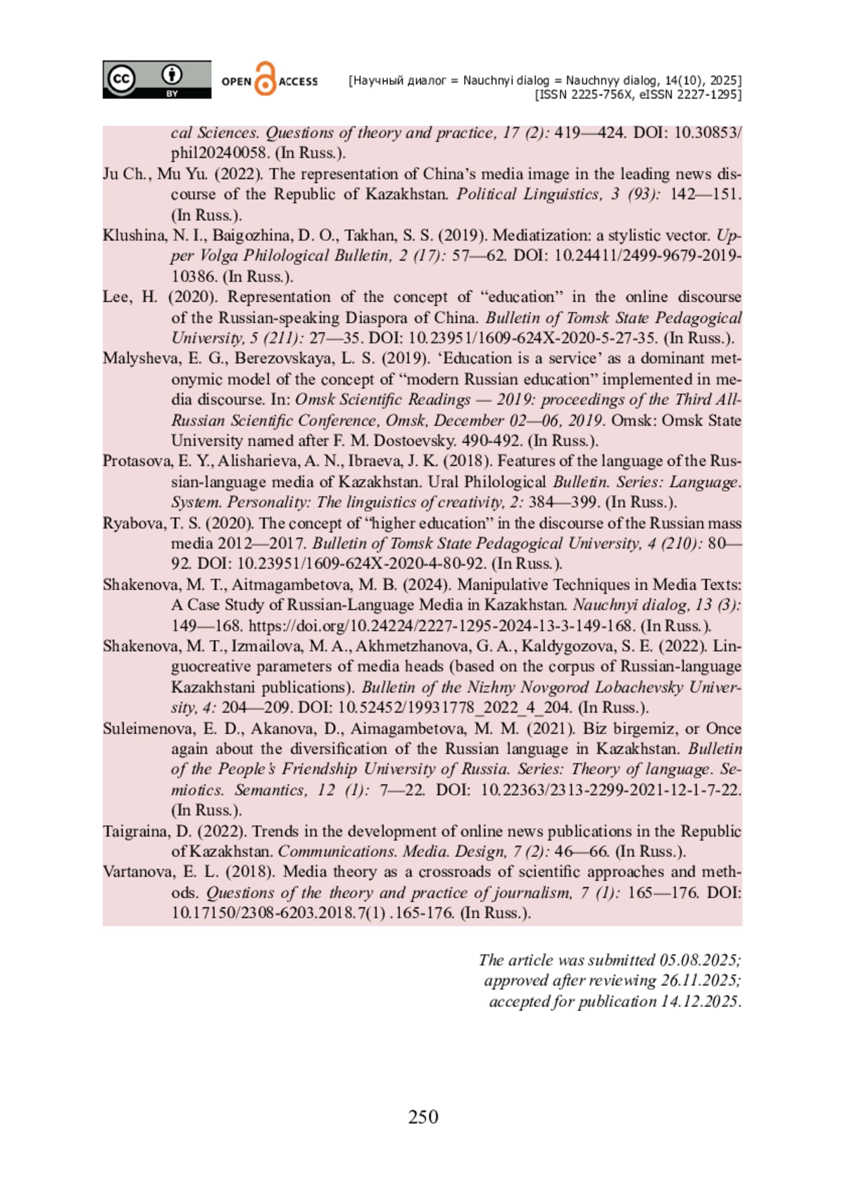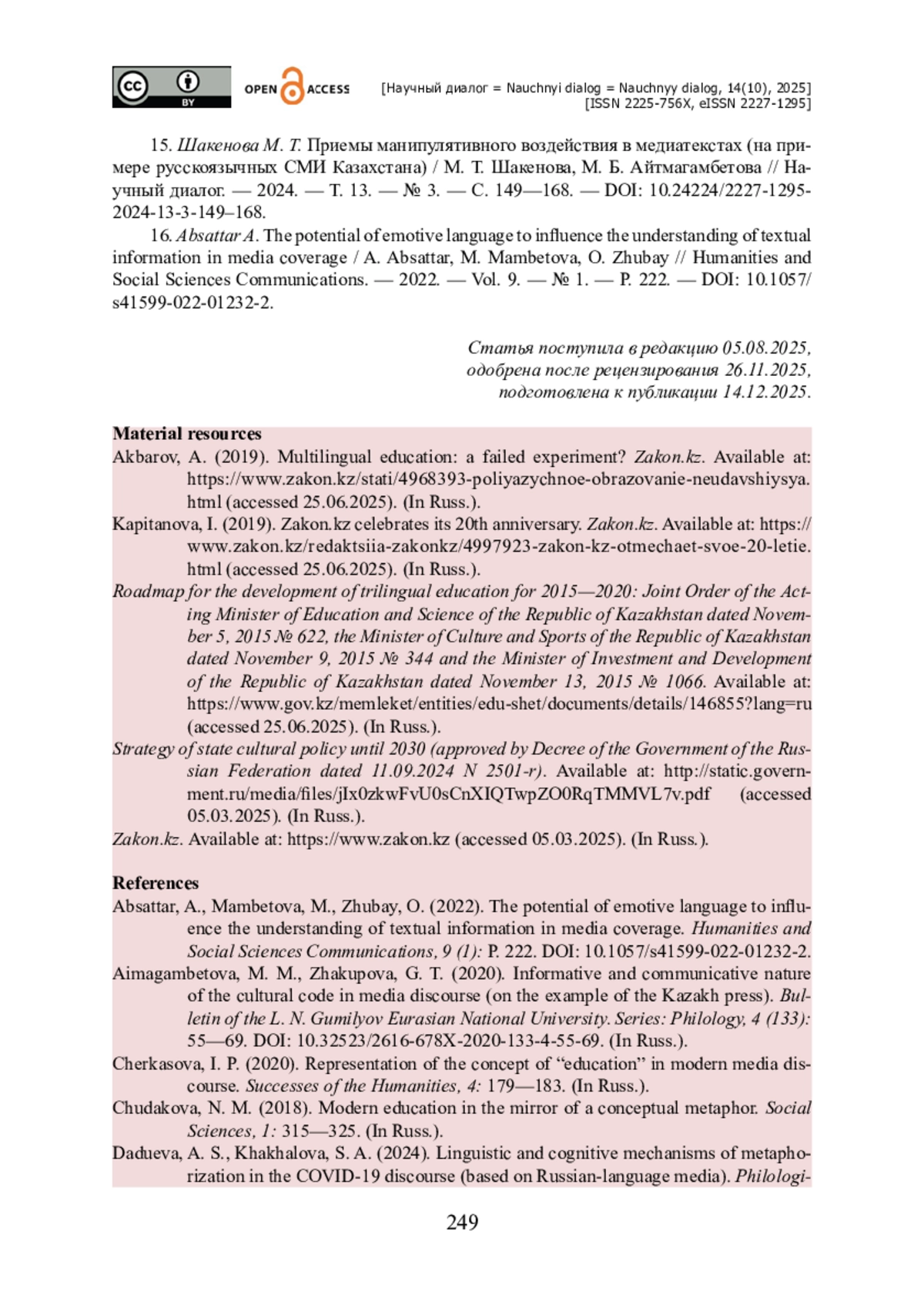15. Шакенова М. Т. Приемы манипулятивного воздействия в медиатекстах (на примере русскоязычных СМИ Казахстана) / М. Т. Шакенова, М. Б. Айтмагамбетова // Научный диалог. - 2024. - Т. 13. - № 3. - С. 149-168. - https://doi.org/10.24224/2227-1295-2024-13-3-149-168.