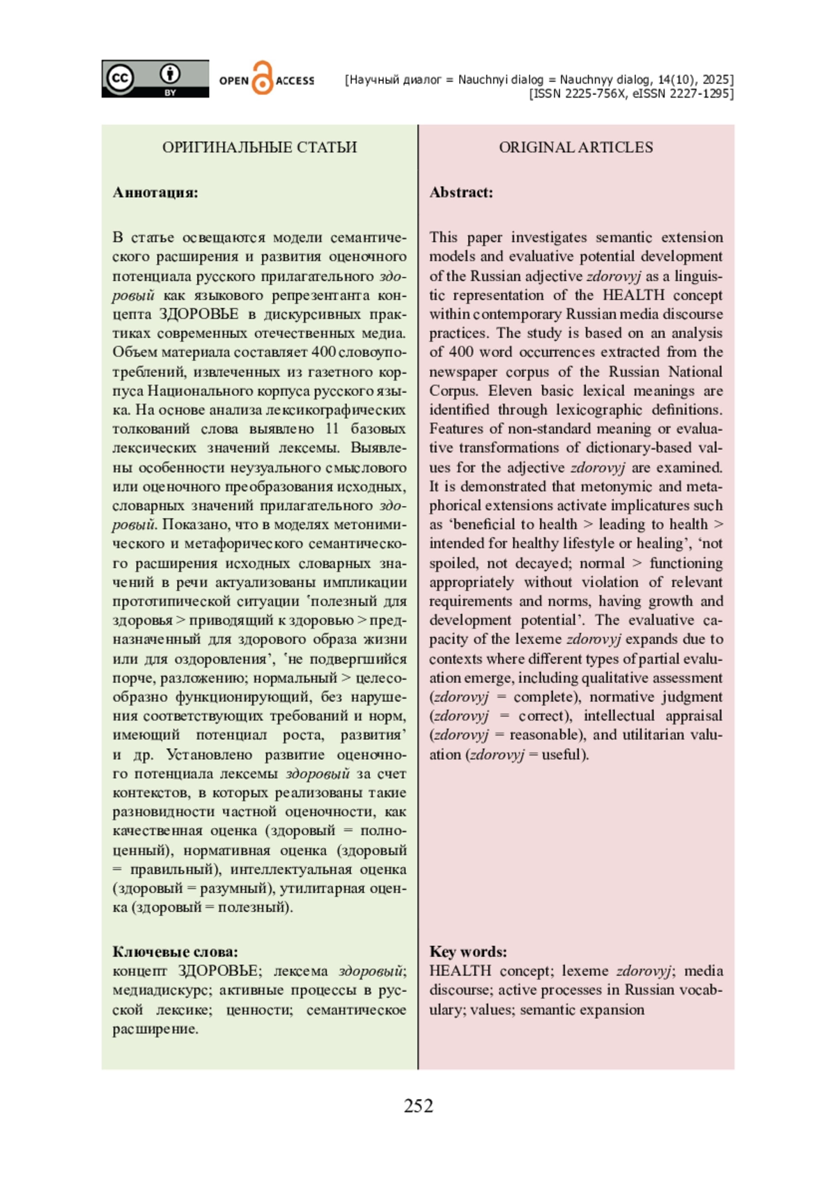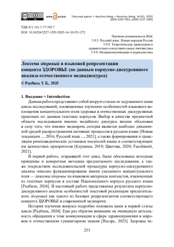 В статье освещаются модели семантического расширения и развития оценочного потенциала русского прилагательного здоровый как языкового репрезентанта концепта ЗДОРОВЬЕ в дискурсивных практиках современных отечественных медиа. Объем материала составляет 400 словоупотреблений, извлеченных из газетного корпуса Национального корпуса русского языка. На основе анализа лексикографических толкований слова выявлено 11 базовых лексических значений лексемы. Выявлены особенности неузуального смыслового или оценочного преобразования исходных, словарных значений прилагательного здоровый. Показано, что в моделях метонимического и метафорического семантического расширения исходных словарных значений в речи актуализованы импликации прототипической ситуации ʽполезный для здоровья > приводящий к здоровью > предназначенный для здорового образа жизни или для оздоровленияʼ, ʽне подвергшийся порче, разложению; нормальный > целесообразно функционирующий, без нарушения соответствующих требований и норм, имеющий потенциал роста, развитияʼ и др. Установлено развитие оценочного потенциала лексемы здоровый за счет контекстов, в которых реализованы такие разновидности частной оценочности, как качественная оценка (здоровый = полноценный), нормативная оценка (здоровый = правильный), интеллектуальная оценка (здоровый = разумный), утилитарная оценка (здоровый = полезный).