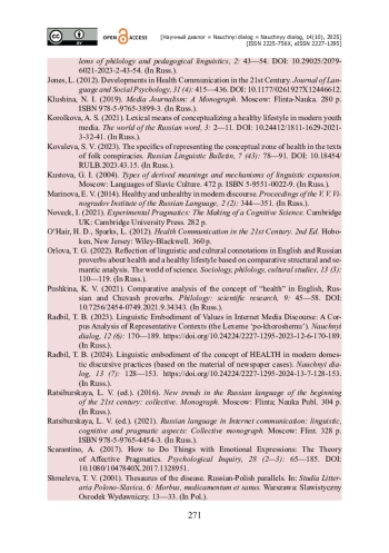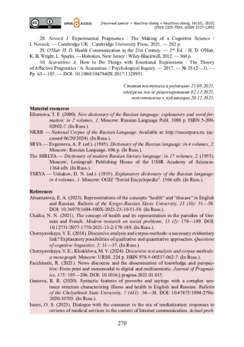 7. Королькова А. С. Лексические средства концептуализации здорового образа жизни в современных молодёжных СМИ / А. С. Королькова // Мир русского слова. - 2021. - № 3. - С. 2-11. - https://doi.org/10.24412/1811-1629-2021-3-32-41.