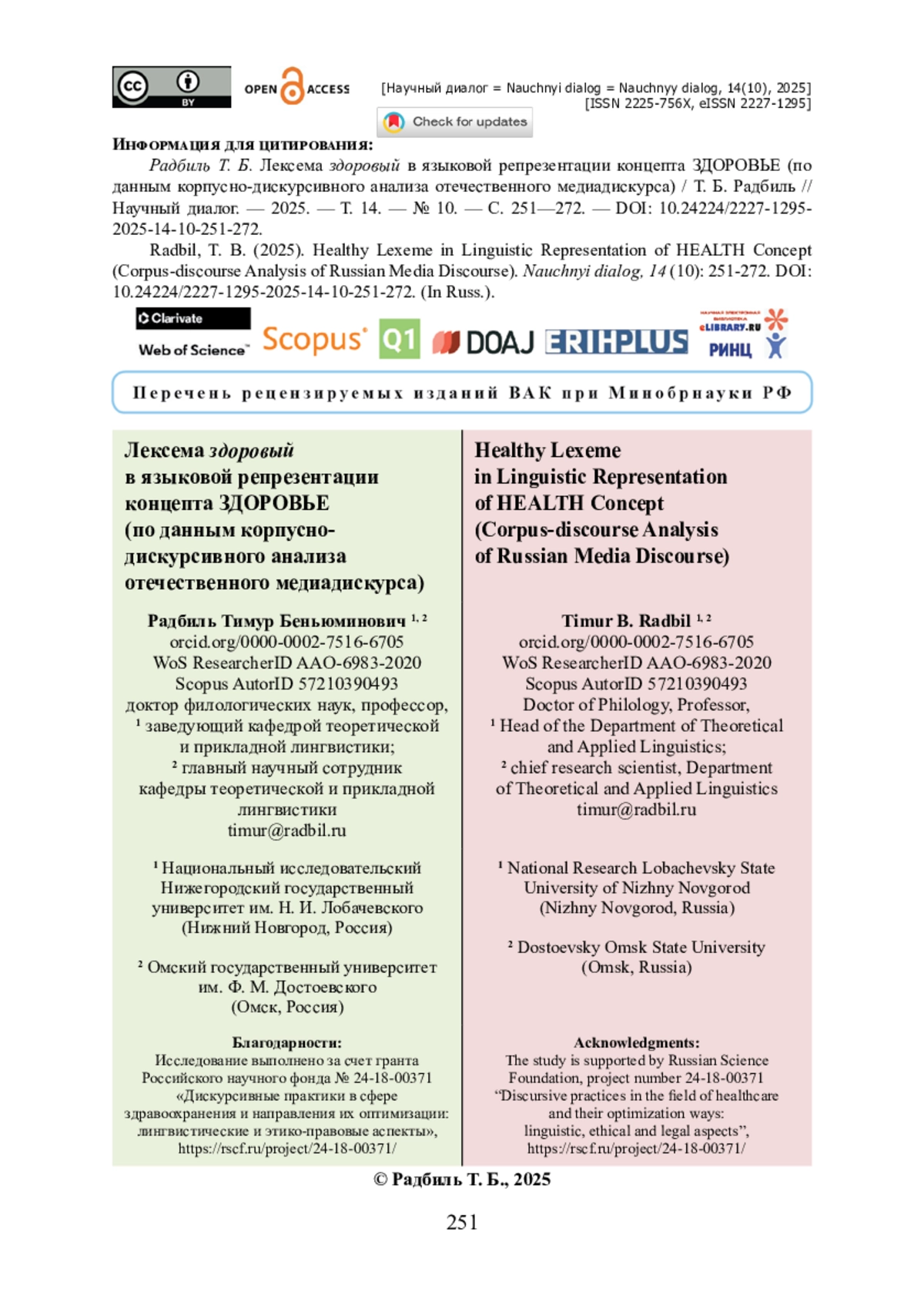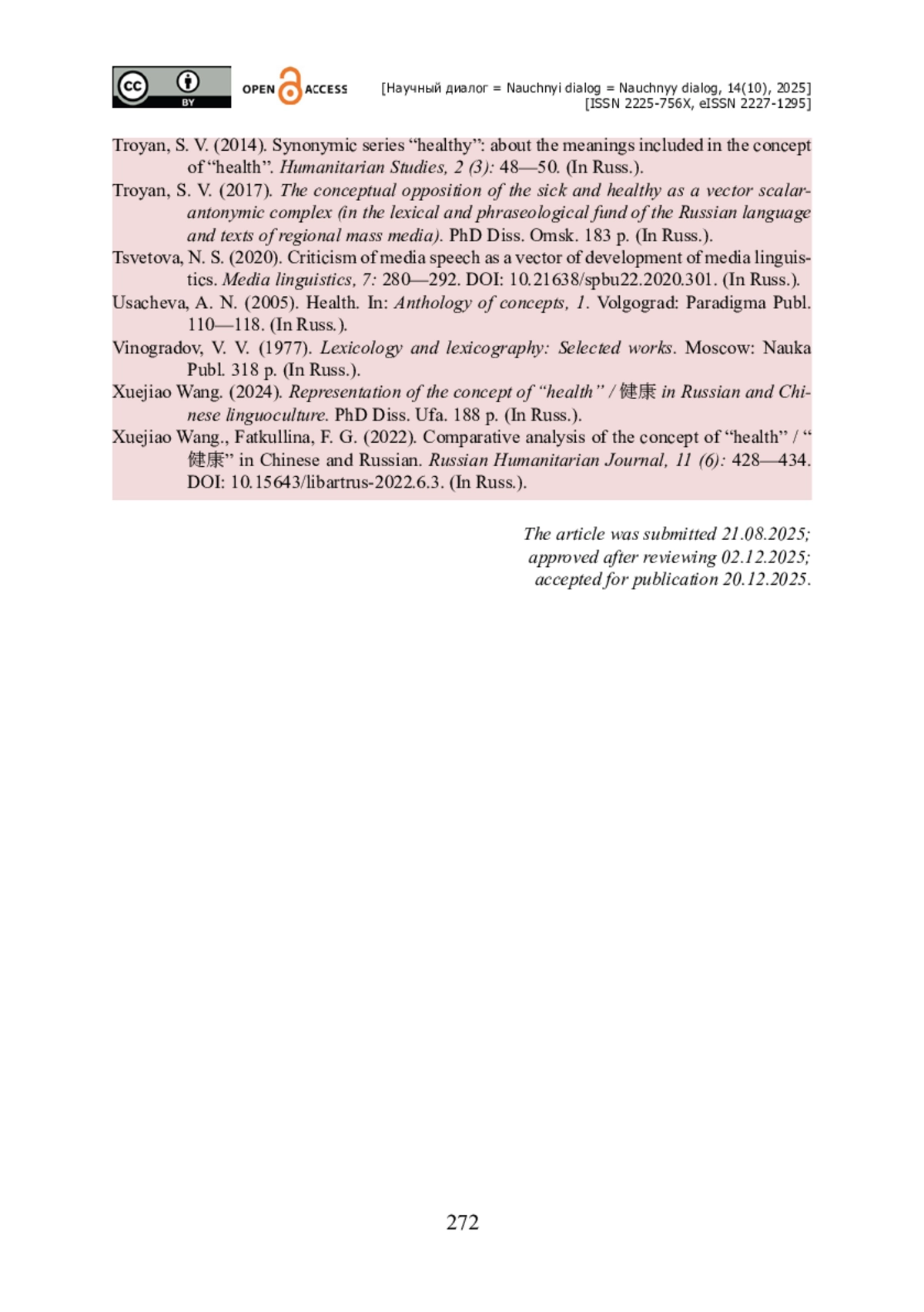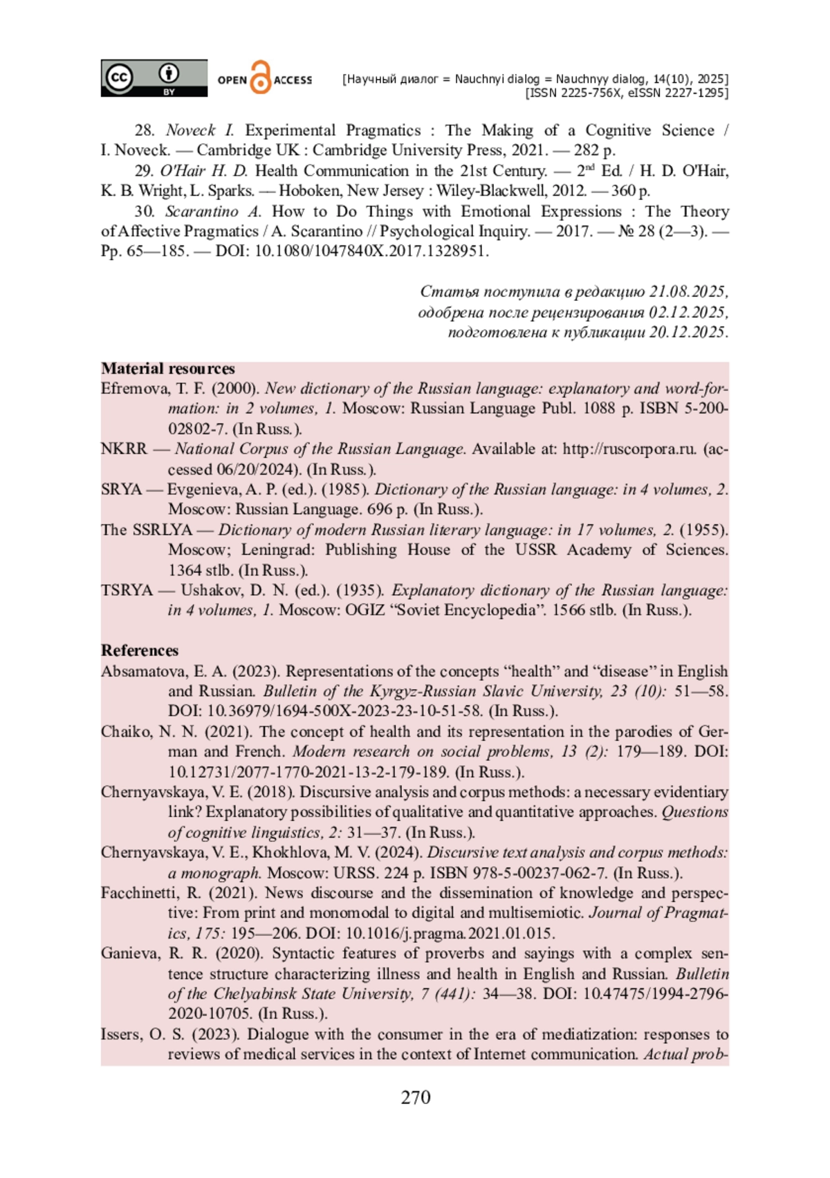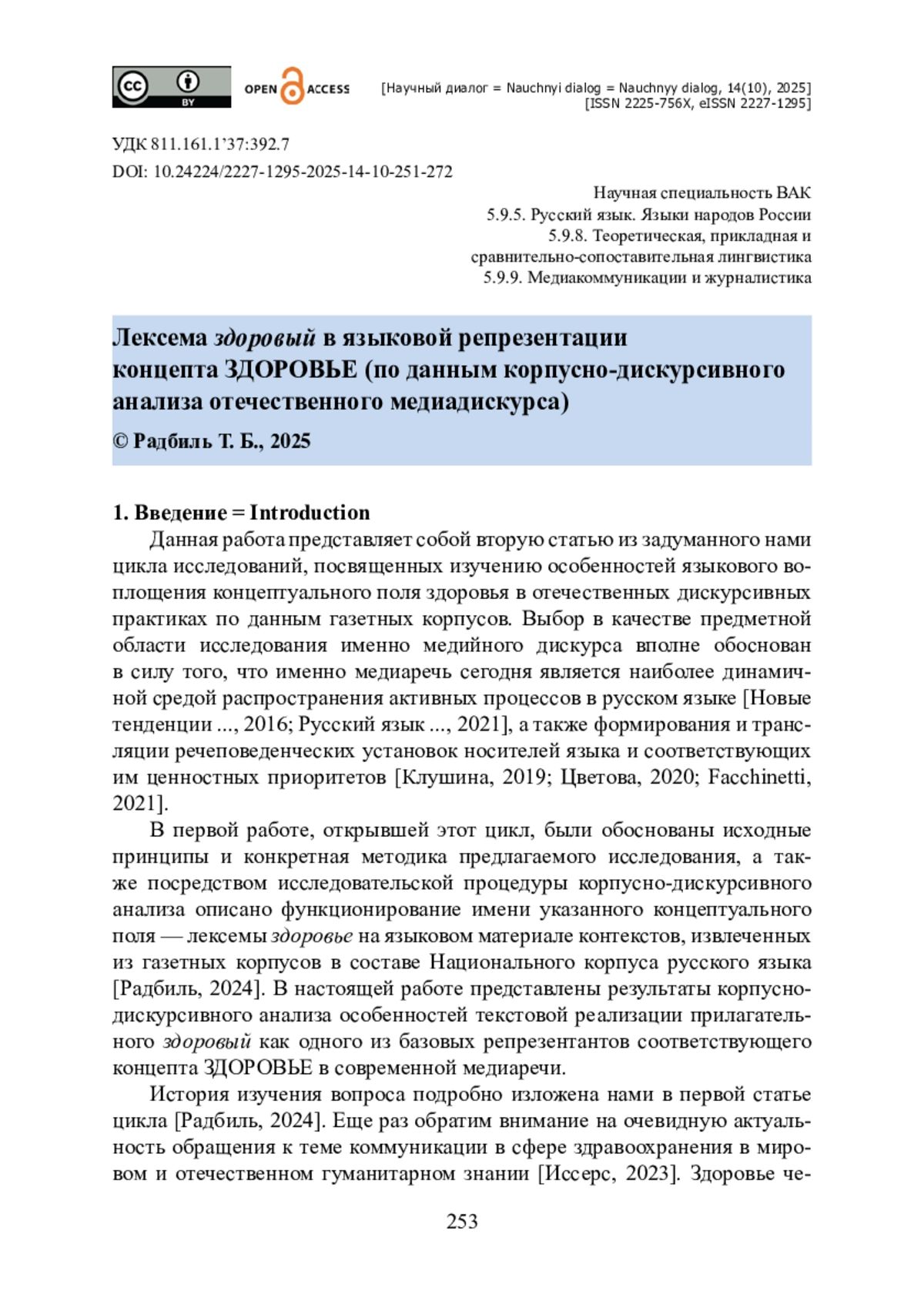 13. Радбиль Т. Б. Языковое воплощение концепта ЗДОРОВЬЕ в современных отечественных дискурсивных практиках (на материале газетных корпусов) / Т. Б. Радбиль // Научный диалог. - 2024. - Т. 13. - № 7. - С. 128-153. - https://doi.org/10.24224/2227-1295-2024-13-7-128-153.