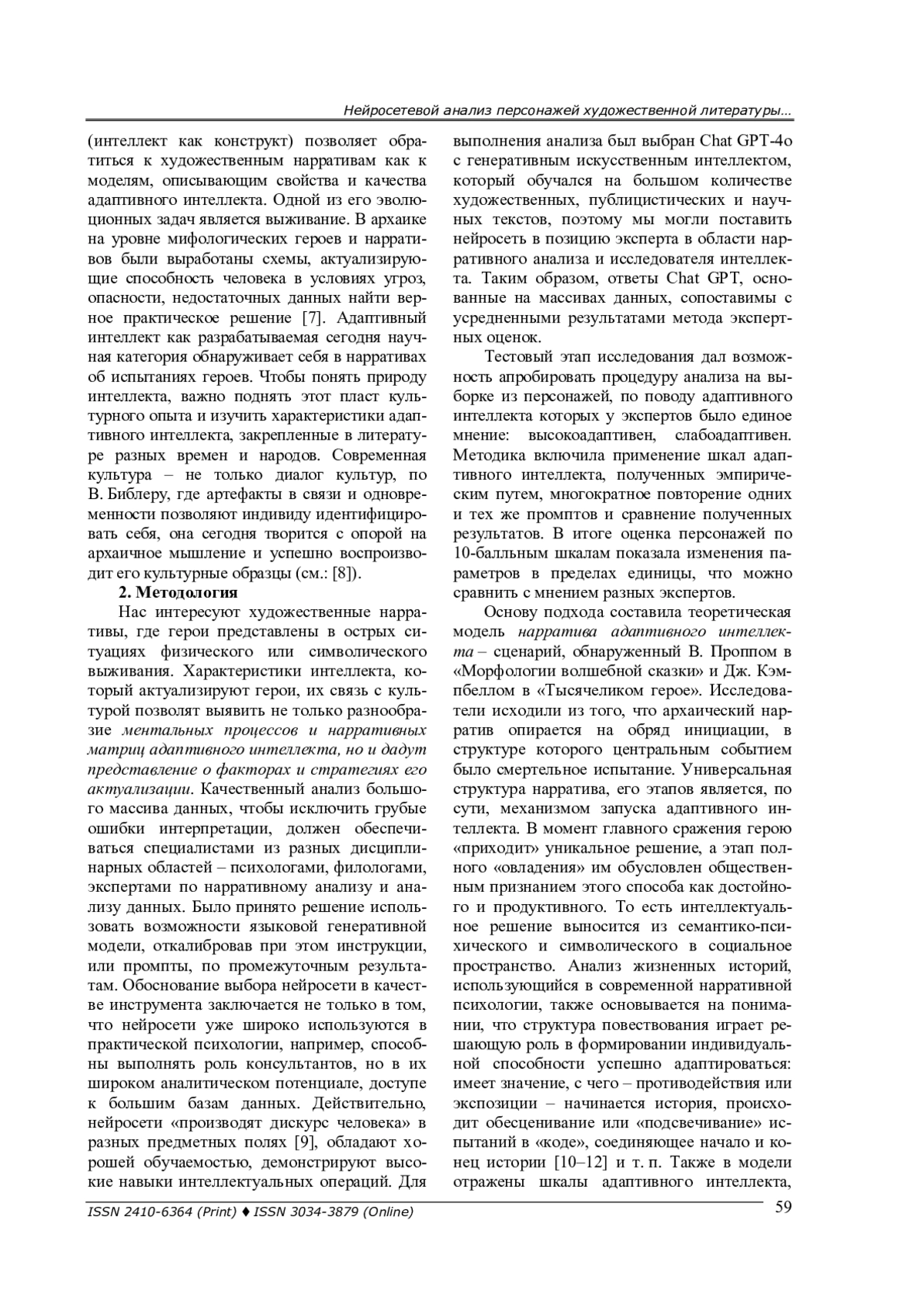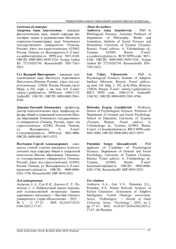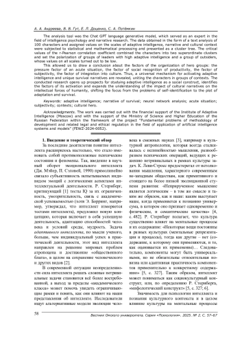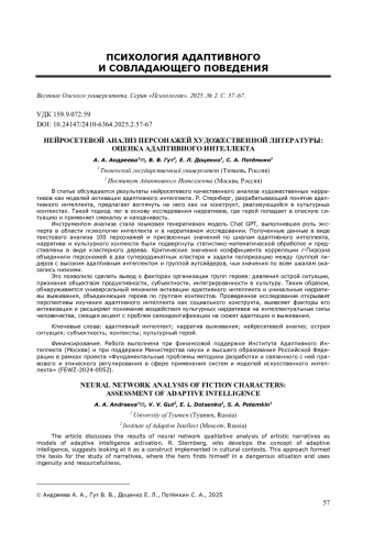 Инструментом анализа стала языковая генеративная модель Chat GPT, выполнившая роль эксперта в области психологии интеллекта и в нарративном исследовании. Полученные данные в виде текстового анализа 100 персонажей и присвоенных значений по шкалам адаптивного интеллекта, нарратива и культурного контекста были подвергнуты статистико-математической обработке и представлены в виде кластерного дерева. Критические значения коэффициента корреляции r -Пирсона объединили персонажей в два суперординатных кластера и задали поляризацию между группой лидеров с высоким адаптивным интеллектом и группой аутсайдеров, чьи значения по всем шкалам оказались низкими.