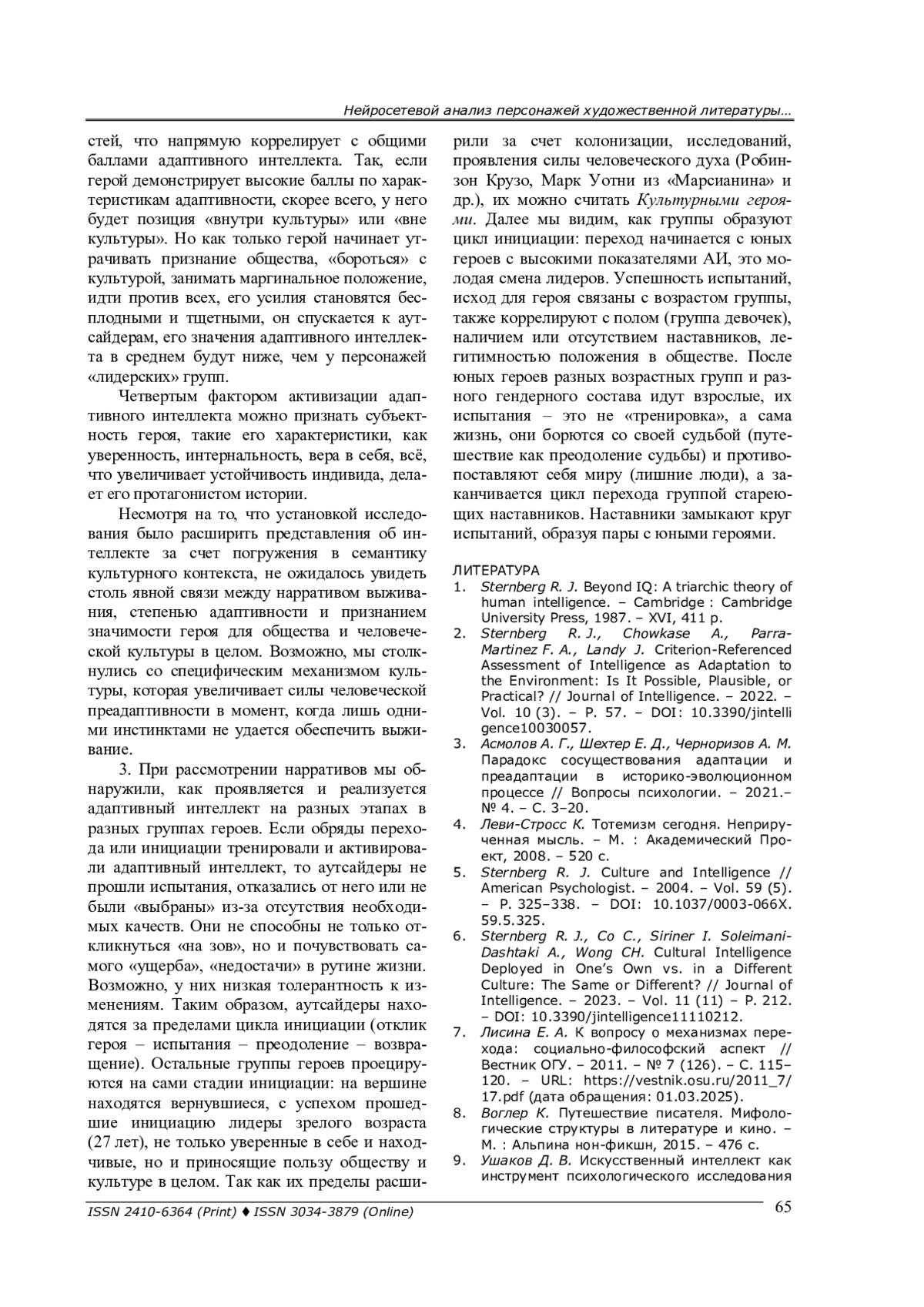Это позволило сделать вывод о факторах организации групп героев: давления острой ситуации, признания обществом продуктивности, субъектности, интегрированности в культуру. Таким образом, обнаруживается универсальный механизм активации адаптивного интеллекта и уникальные нарративы выживания, объединяющие героев по группам контекстов. Проведенное исследование открывает перспективы изучения адаптивного интеллекта как социального конструкта, выявляет факторы его активизации и расширяет понимание воздействия культурных нарративов на интеллектуальные силы человечества, смещая акцент с проблем самоидентификации на сюжет адаптации и выживания.