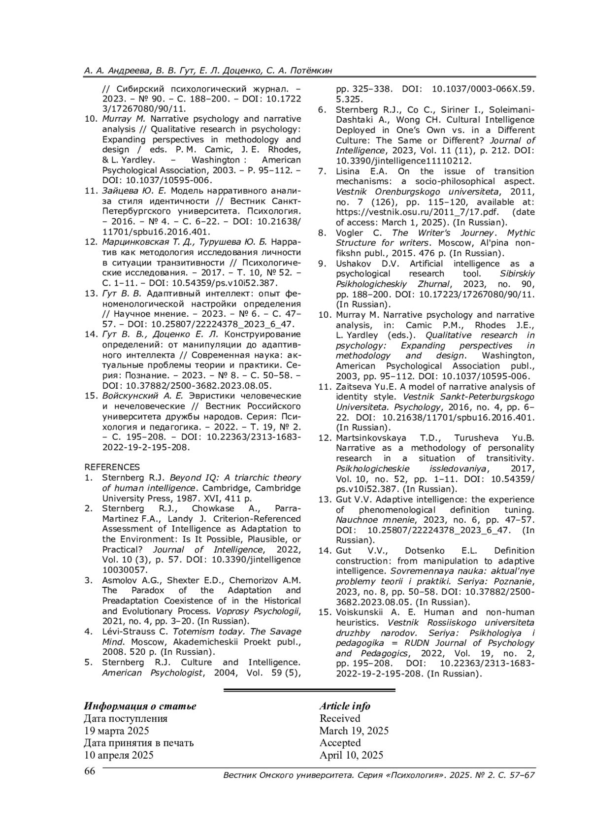 6. Sternberg R. J., Co C., Siriner I. Soleimani-Dashtaki A., Wong CH. Cultural Intelligence Deployed in One’s Own vs. in a Different Culture: The Same or Different? // Journal of Intelligence. - 2023. - Vol. 11 (11) - P. 212. -. DOI: 10.3390/jintelligence11110212 EDN: GACJHI