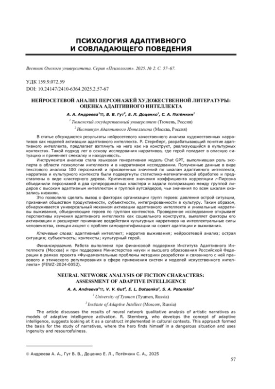 В статье обсуждаются результаты нейросетевого качественного анализа художественных нарративов как моделей активации адаптивного интеллекта. Р. Стернберг, разрабатывающий понятие адаптивного интеллекта, предлагает взглянуть на него как на конструкт, реализующийся в культурных контекстах. Такой подход лег в основу исследования нарративов, где герой попадает в опасную ситуацию и применяет смекалку и находчивость.