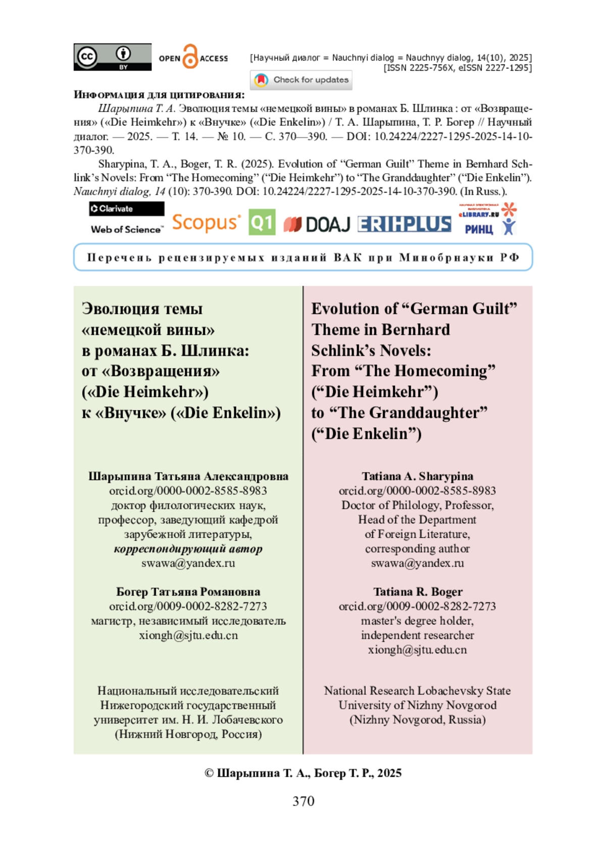 14. Шарыпина Т. А. «Возвращение» Бернхарда Шлинка в литературном контексте Германии новейшего времени / Т. А. Шарыпина // Вестник Нижегородского университета им. Н. И. Лобачевского. - 2011. - № 6 (2). - С. 740-744.