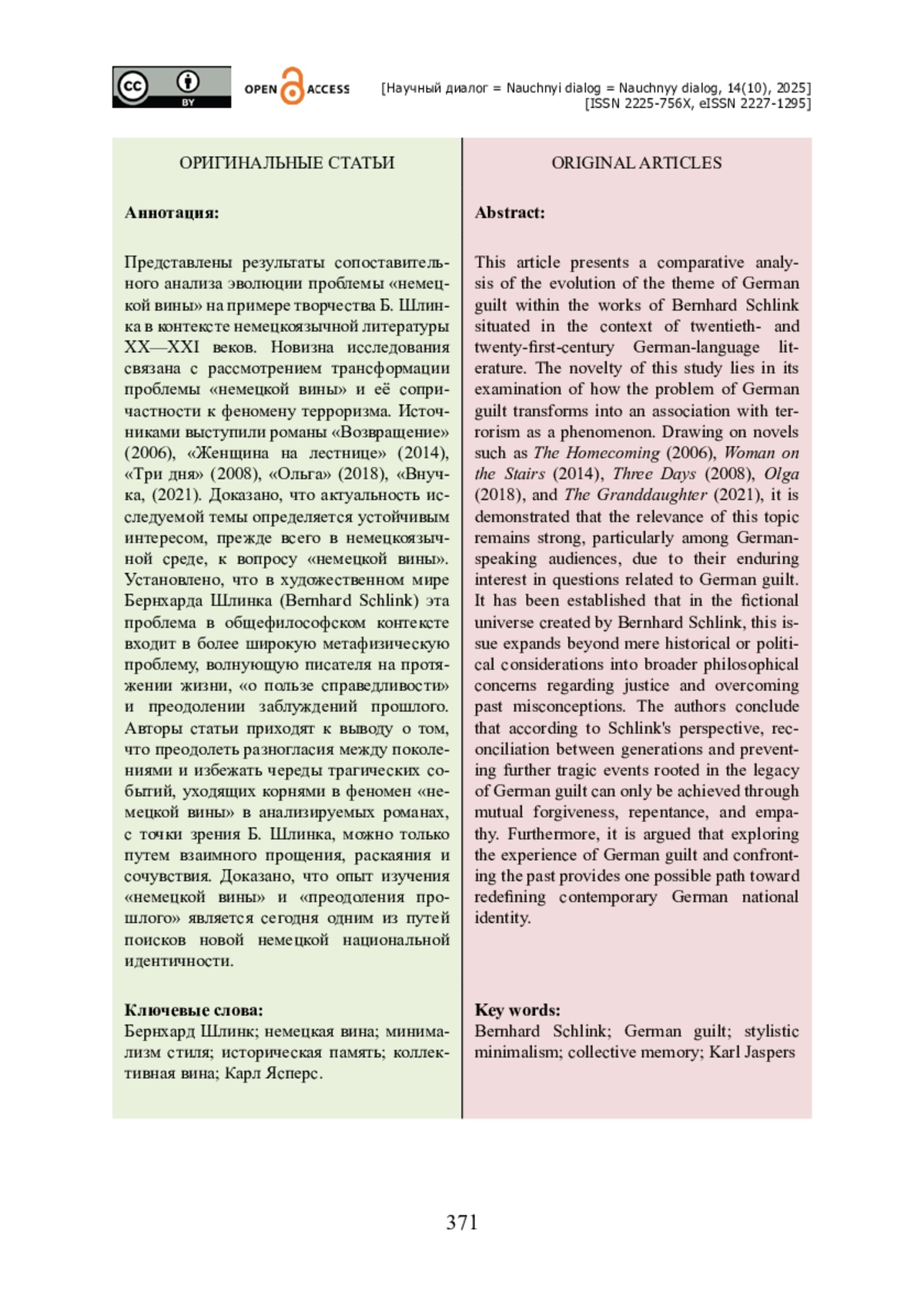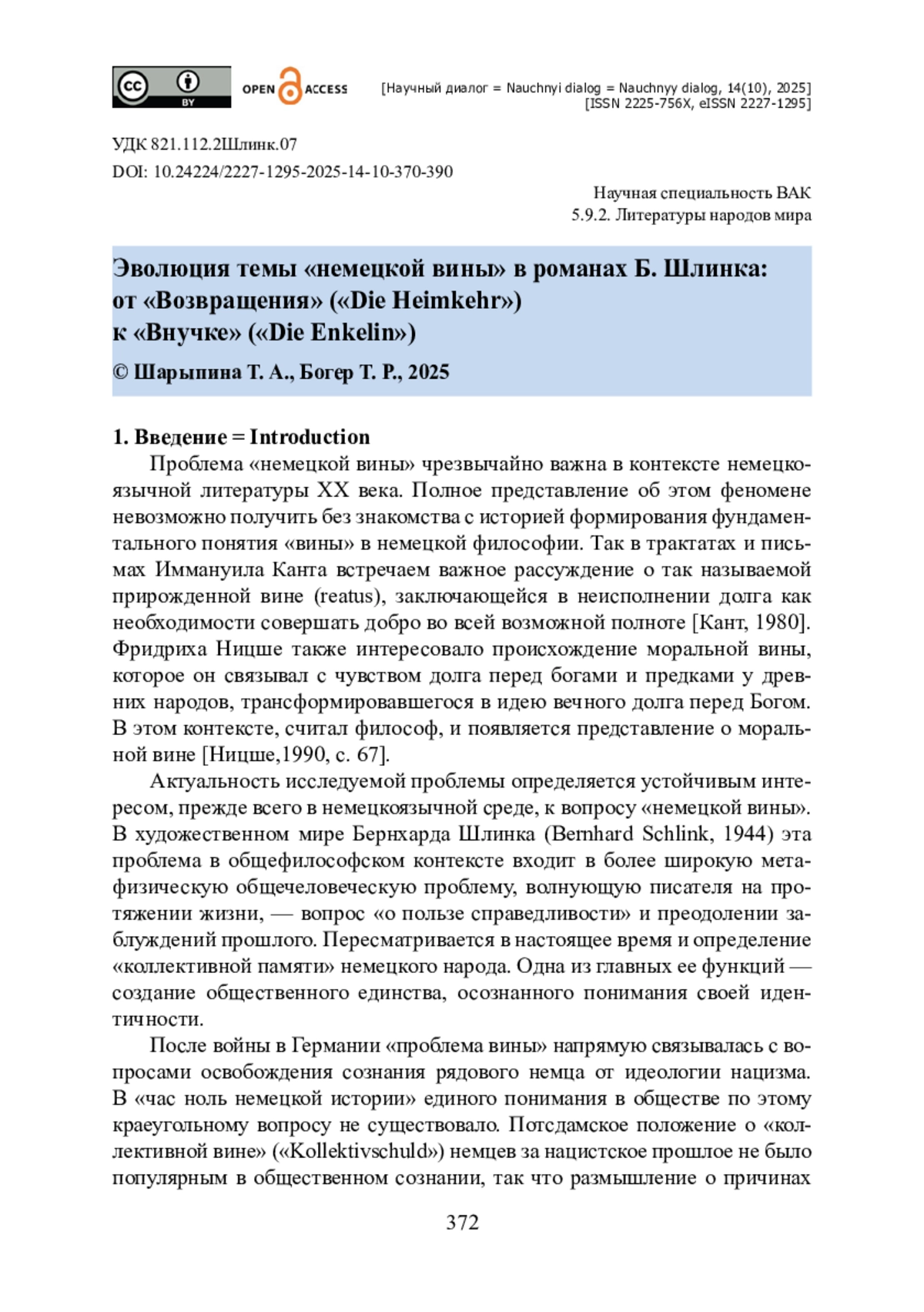 Представлены результаты сопоставительного анализа эволюции проблемы «немецкой вины» на примере творчества Б. Шлинка в контексте немецкоязычной литературы XX—XXI веков. Новизна исследования связана с рассмотрением трансформации проблемы «немецкой вины» и её сопричастности к феномену терроризма. Источниками выступили романы «Возвращение» (2006), «Женщина на лестнице» (2014), «Три дня» (2008), «Ольга» (2018), «Внучка, (2021). Доказано, что актуальность исследуемой темы определяется устойчивым интересом, прежде всего в немецкоязычной среде, к вопросу «немецкой вины». Установлено, что в художественном мире Бернхарда Шлинка (Bernhard Schlink) эта проблема в общефилософском контексте входит в более широкую метафизическую проблему, волнующую писателя на протяжении жизни, «о пользе справедливости» и преодолении заблуждений прошлого. Авторы статьи приходят к выводу о том, что преодолеть разногласия между поколениями и избежать череды трагических событий, уходящих корнями в феномен «немецкой вины» в анализируемых романах, с точки зрения Б. Шлинка, можно только путем взаимного прощения, раскаяния и сочувствия. Доказано, что опыт изучения «немецкой вины» и «преодоления прошлого» является сегодня одним из путей поисков новой немецкой национальной идентичности.