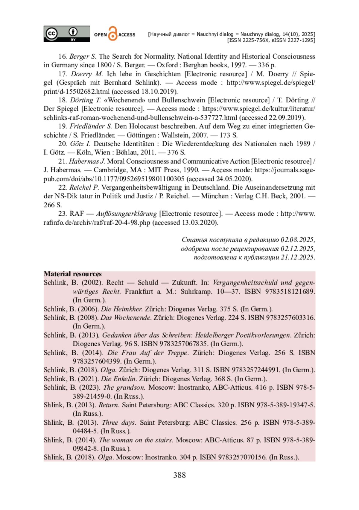 17. Doerry M. Ich lebe in Geschichten [Electronic resource] / M. Doerry // Spiegel (Gespräch mit Bernhard Schlink). - Access mode : http://www.spiegel.de/spiegel/print/d-15502682.html (accessed 18.10.2019).