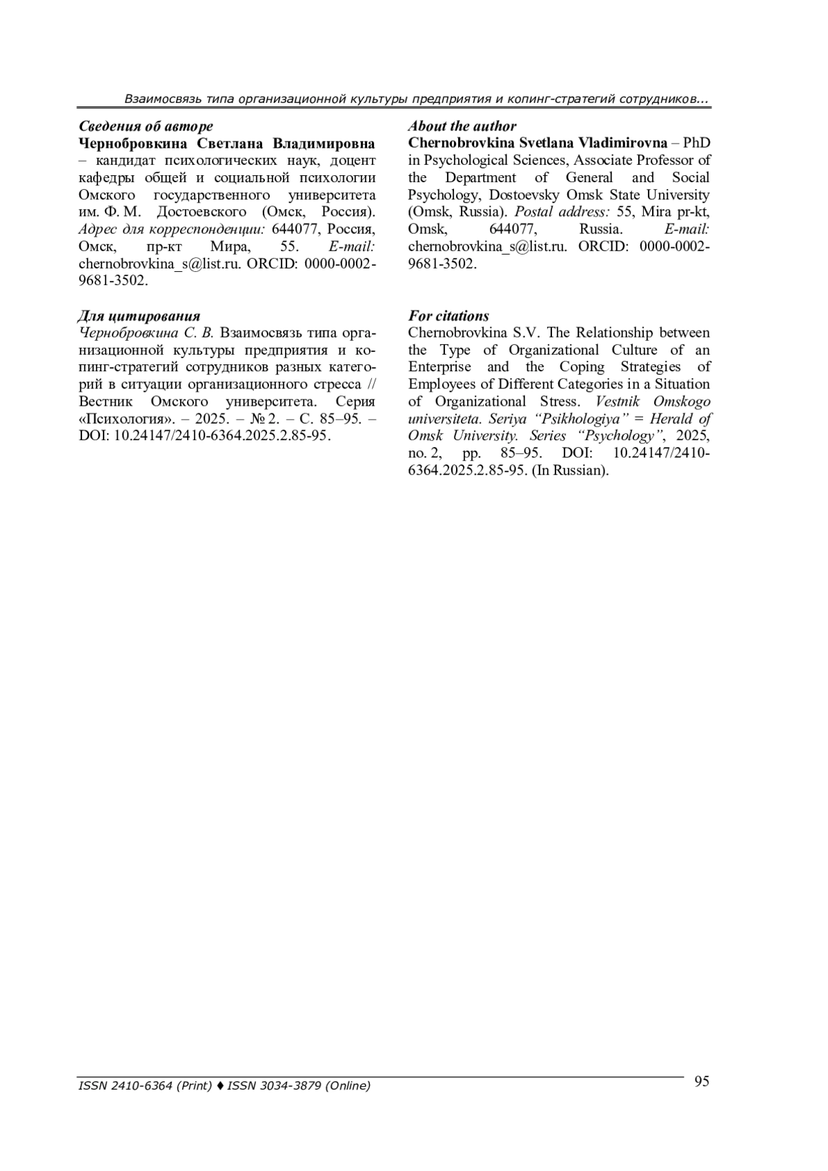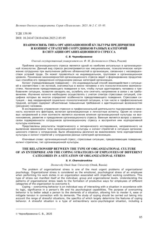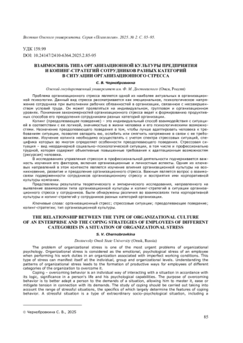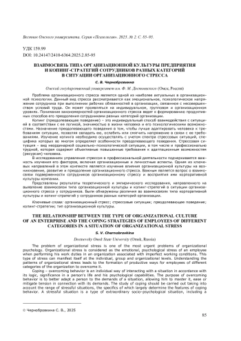 Представлены результаты теоретического и эмпирического исследования, направленного на выявление взаимосвязи типа организационной культуры и копинг-стратегий в ситуации организационного стресса у сотрудников. Были обнаружены различия во взаимосвязях типа корпоративной культуры и копинг-стратегий у сотрудников разных категорий организации.