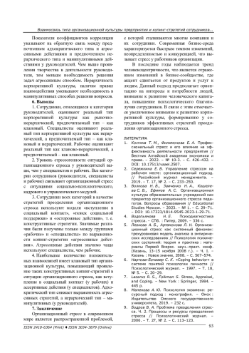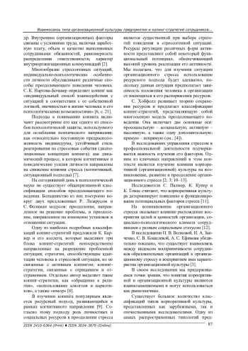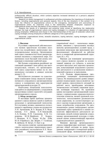 В исследованиях управления стрессом в профессиональной деятельности подчеркивается важность изучения его факторов, включая организационные и личностные аспекты. Одним из ключевых направлений в этом контексте является изучение влияния организационной культуры на возникновение, развитие и преодоление организационного стресса. Важным является вопрос о взаимосвязи подверженности сотрудников организационному стрессу и восприятия ими корпоративной культуры компании.