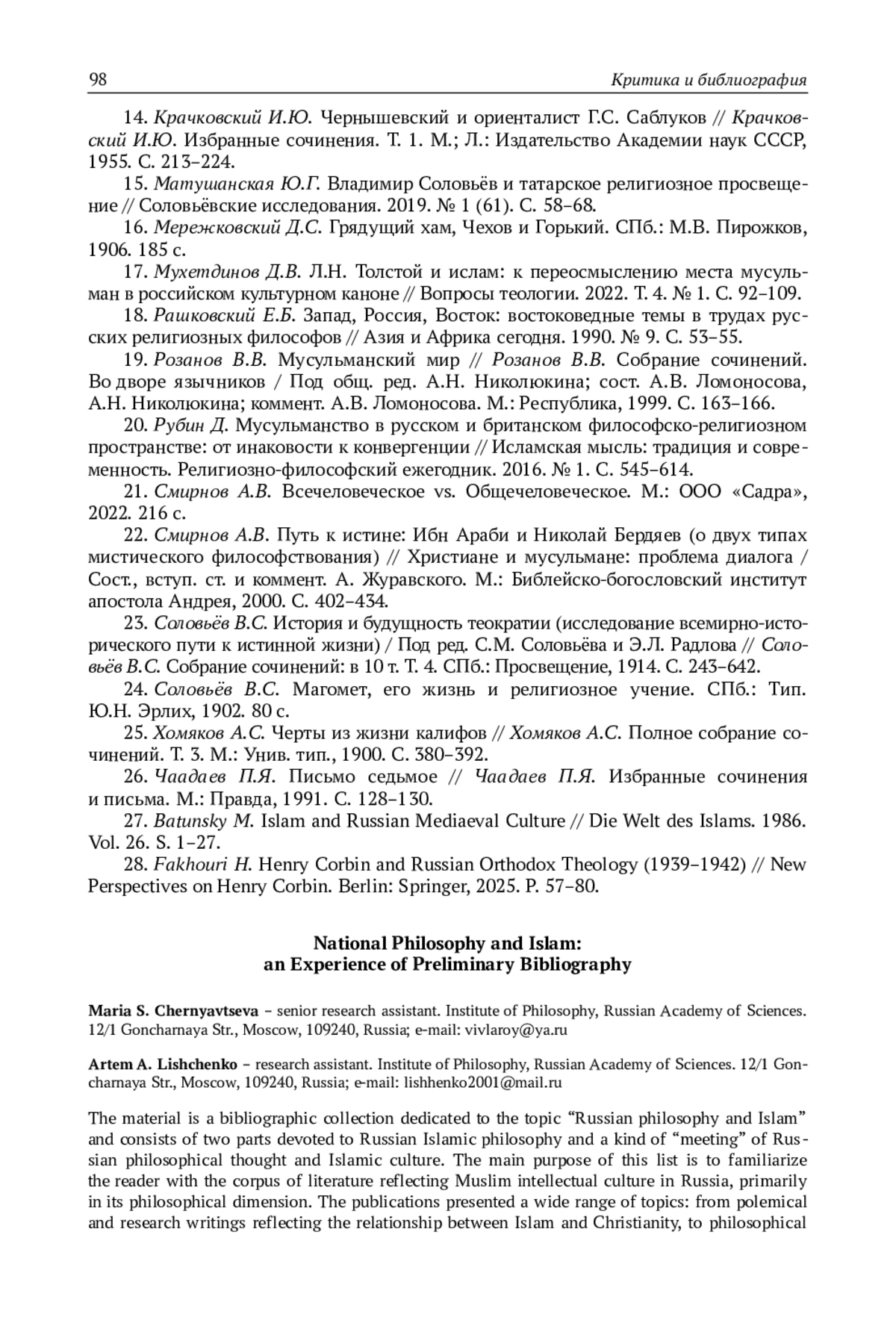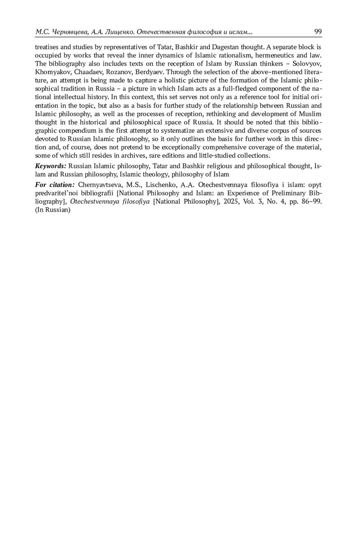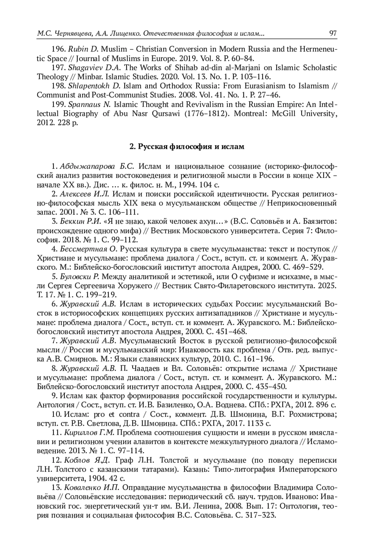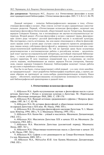 Материал представляет собой библиографический свод, посвящённый теме «Отечественная философия и ислам», и состоит из двух частей, посвящённых соответственно отечественной исламской философии и своего рода «встрече» русской философской мысли и исламской культуры. Основная цель данного списка – ознакомить читателя с корпусом литературы, отражающей мусульманскую интеллектуальную культуру на территории России, прежде всего – в её философском измерении. Представленные издания охватывают широкий круг тем: от полемических и исследовательских сочинений, отражающих взаимоотношения ислама и христианства, до философских трактатов и исследований представителей татарской, башкирской и дагестанской мысли. Отдельный блок занимают труды, раскрывающие внутреннюю динамику исламских рационализма, герменевтики и права. В библиографию также включены тексты, посвящённые рецепции ислама русскими мыслителями – Соловьёвым, Хомяковым, Чаадаевым, Розановым, Бердяевым. Через отбор указанной выше литературы предпринимается попытка запечатлеть целостную картину становления исламской философской традиции в России – картину, в которой ислам выступает полноправным компонентом отечественной интеллектуальной истории. В этом контексте данный свод служит не только справочным инструментом для первоначальной ориентировки в теме, но и основой для дальнейшего изучения связей русской и исламской философии, а также процессов рецепции, переосмысления и развития мусульманской мысли в историко-философском пространстве России. Отметим, что настоящий библиографический свод представляет собой первую попытку систематизации обширного и разнородного корпуса источников, посвящённых отечественной исламской философии, поэтому он лишь намечает основу для дальнейшей работы в этом направлении и, разумеется, не претендует на исключительную полноту охвата материала, часть которого до сих пор пребывает в архивах, редких изданиях и малоизученных сборниках.