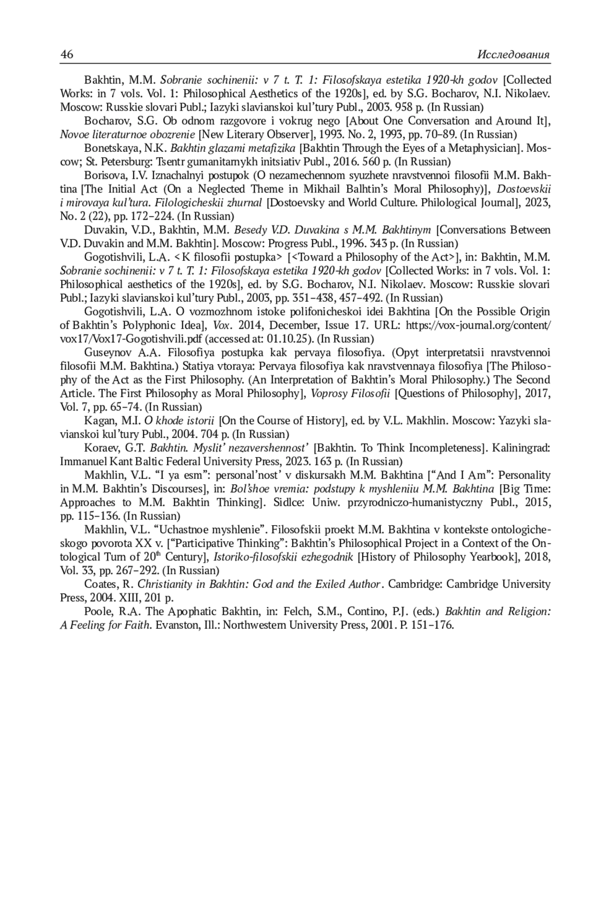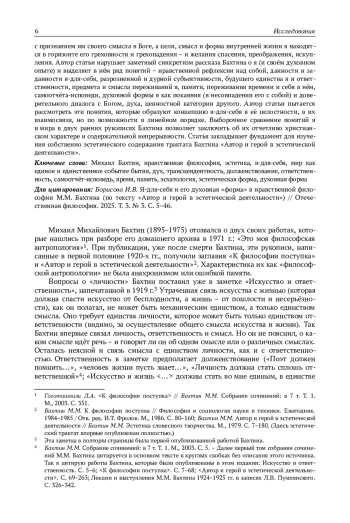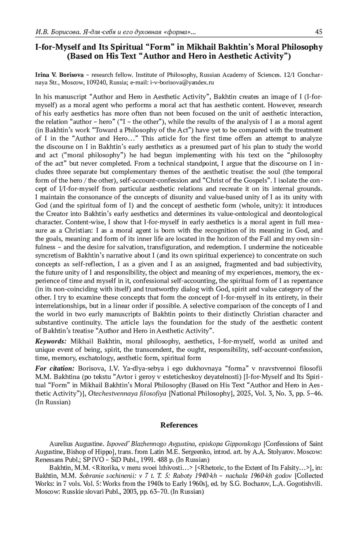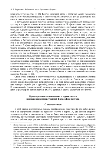 В рукописи «Автор и герой в эстетической деятельности» Бахтин создаёт образ я (я-для-себя) как нравственного субъекта, который совершает нравственный поступок с эстетическим содержанием. Но исследования его ранней эстетики чаще фокусируются на единице эстетического взаимодействия, отношении «автор - герой» («я - другой»). А результаты анализа я как нравственного субъекта (по работе «К философии поступка») пока не были сопоставлены с трактовкой я в «Авторе и герое…». Автор статьи впервые предпринимает (первичный) анализ дискурса я в ранней эстетике Бахтина как предполагаемой части его замысла исследования мира и поступка («нравственной философии»), который он начал воплощать текстом о «философии поступка», но не завершил. В техническом отношении автор статьи обосновывает принадлежность к дискурсу я трёх отдельных, но содержательно дополняющих друг друга сюжетов эстетического трактата: о душе (временной форме героя/другого), самоотчёте-исповеди и «Христе Евангелия». Автор статьи отделяет концепцию я-для-себя от частных эстетических связей и воссоздаёт её на её внутренних основаниях. Автор сохраняет созвучие понятий разрозненности и ценностного единства я в его единстве с Богом, духовной формы я - и концепции эстетической формы (целого, единства): оно вводит Творца в раннюю эстетику Бахтина и определяет её ценностно-онтологический и деонтологический характер. В содержательном плане автор статьи показывает, что я-для-себя в ранней эстетике является нравственным субъектом в полной мере как христианин: он рождается с признанием им своего смысла в Боге, а цели, смысл и форма внутренней жизни я находятся в горизонте его греховности и грехопадения - и желания спасения, преображения, искупления. Автор статьи нарушает заметный синкретизм рассказа Бахтина о я (и своём духовном опыте) и выделяет в нём ряд понятий - нравственной рефлексии над собой, данности и заданности я-для-себя, разрозненной и дурной субъективности, будущего единства я и ответственности, предмета и смысла переживаний я, памяти, переживания времени и себя в нём, самоотчёта-исповеди, духовной формы я как покаяния (в несовпадении его с собой) и доверительного диалога с Богом, духа, ценностной категории другого. Автор статьи пытается рассмотреть эти понятия, которые образуют концепцию я-для-себя в её целостности, в их взаимосвязи, но по возможности в линейном порядке. Выборочное сравнение понятий я и мира в двух ранних рукописях Бахтина позволяет заключить об их отчетливо христианском характере и содержательной непрерывности. Статья закладывает фундамент для изучения собственно эстетического содержания трактата Бахтина «Автор и герой в эстетической деятельности».