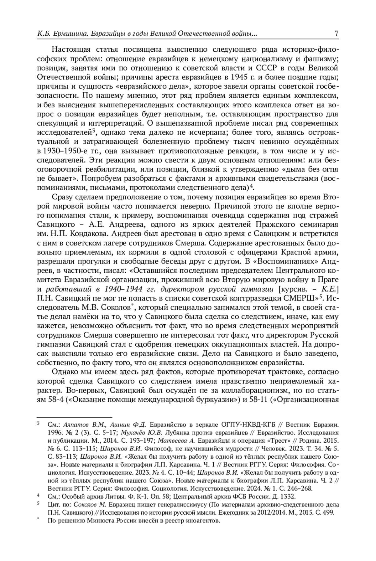 25. Шаронов В.И. “Желал бы получить работу в одной из тёплых республик нашего Союза”. Новые материалы к биографии Л.П. Карсавина. Ч. 2 // Вестник РГГУ. Серия: Философия. Социология. Искусствоведение. 2024. № 1. С. 246-268. EDN: HVBVMT