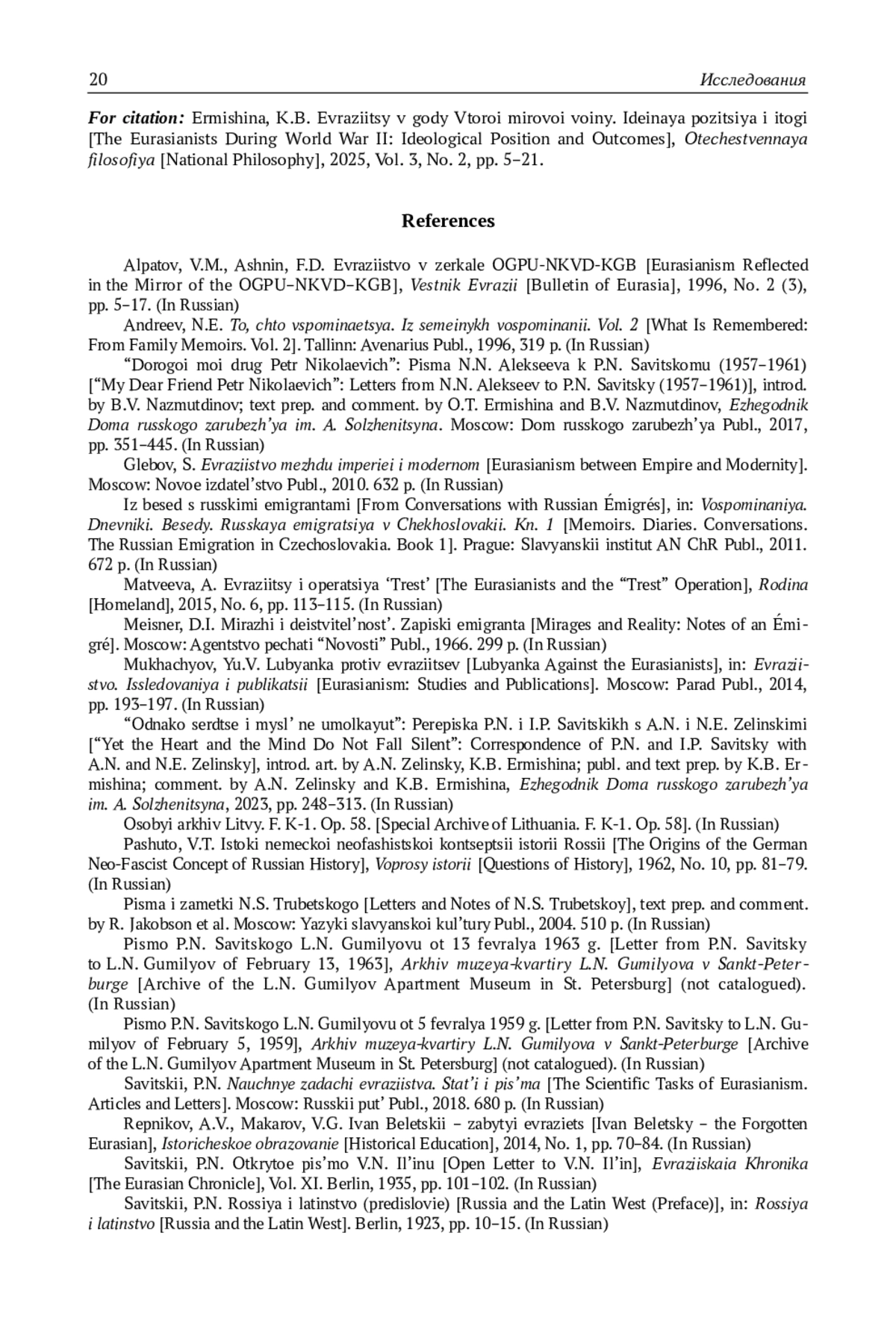 1. Алпатов В.М., Ашнин Ф.Д. Евразийство в зеркале ОГПУ-НКВД-КГБ // Вестник Евразии. 1996. № 2 (3). С. 5-17. EDN: HZBXRL