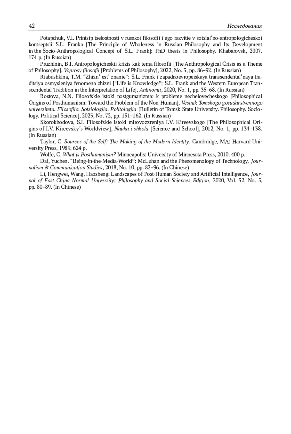 11. Ростова Н.Н. Философские истоки постгуманизма: к проблеме нечеловеческого // Вестник Томского государственного университета. Философия. Социология. Политология. 2023. № 72. С. 151-162.