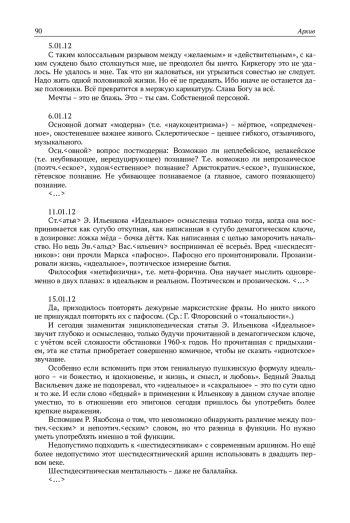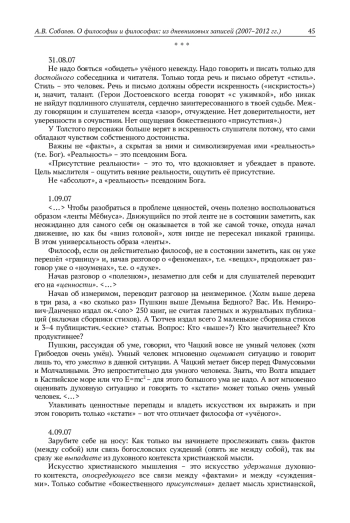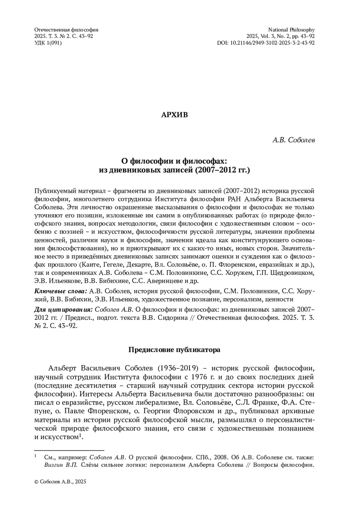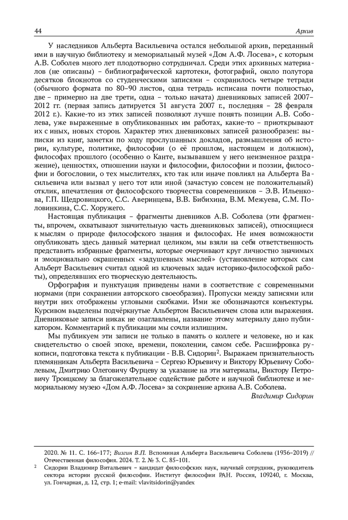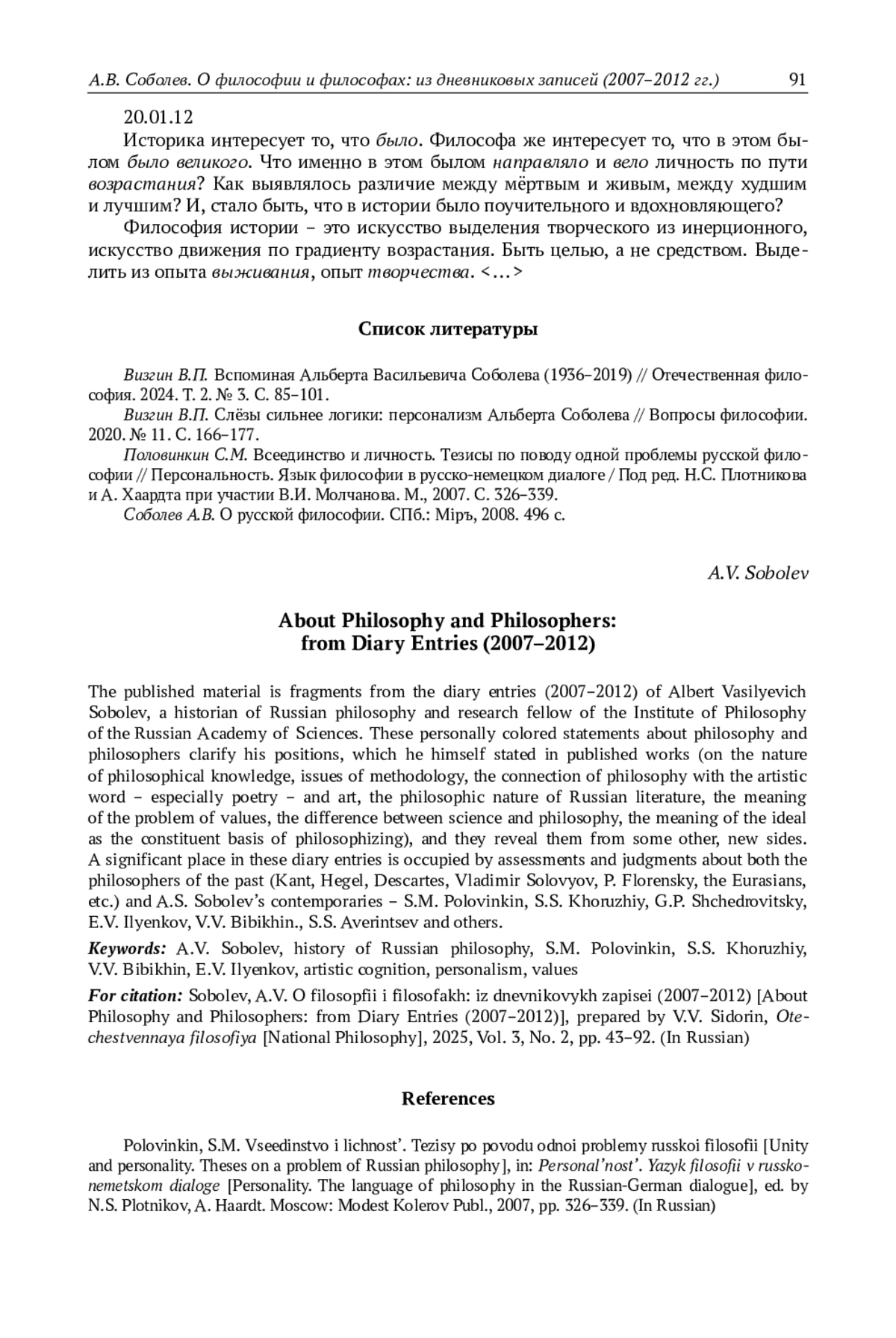 Публикуемый материал – фрагменты из дневниковых записей (2007–2012) историка русской философии, многолетнего сотрудника Института философии РАН Альберта Васильевича Соболева. Эти личностно окрашенные высказывания о философии и философах не только уточняют его позиции, изложенные им самим в опубликованных работах (о природе философского знания, вопросах методологии, связи философии с художественным словом – особенно с поэзией – и искусством, философичности русской литературы, значении проблемы ценностей, различии науки и философии, значении идеала как конституирующего основания философствования), но и приоткрывают их с каких-то иных, новых сторон. Значительное место в приведённых дневниковых записях занимают оценки и суждения как о философах прошлого (Канте, Гегеле, Декарте, Вл. Соловьёве, о. П. Флоренском, евразийцах и др.), так и современниках А. В. Соболева – С. М. Половинкине, С. С. Хоружем, Г. П. Щедровицком, Э. В. Ильенкове, В. В. Бибихине, С. С. Аверинцеве и др.