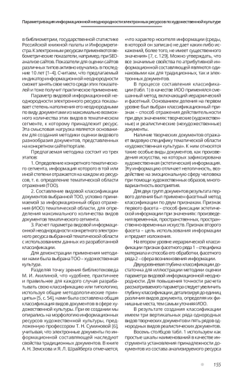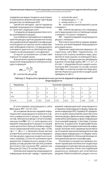 Предлагается к использованию комплексный индикатор информационной неоднородности электронных информационных ресурсов по двум параметрам: виду информации и форме ее представления. Этот индикатор может войти в комплекс вебометрических показателей и применяться для оценивания неоднородности, содержащейся на ресурсе информации, влияющей на работоспособность, востребованность и в целом на качество электронных ресурсов. Основное внимание уделяется параметру видовой информационной неоднородности. Выведена формула для его расчета на основе шкал наименований видов документов. Описывается методика вычисления параметра для тематической области - художественная культура. Создан информационный образ отражения тематической области в форме классификации, которая стала основой для оценивания видовой неоднородности по выведенной формуле. Охарактеризованы два подхода к расчету видовой неоднородности. Рассматривается положительное и отрицательное влияние больших значений указанных параметров на восприятие электронного ресурса пользователями.