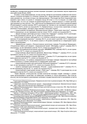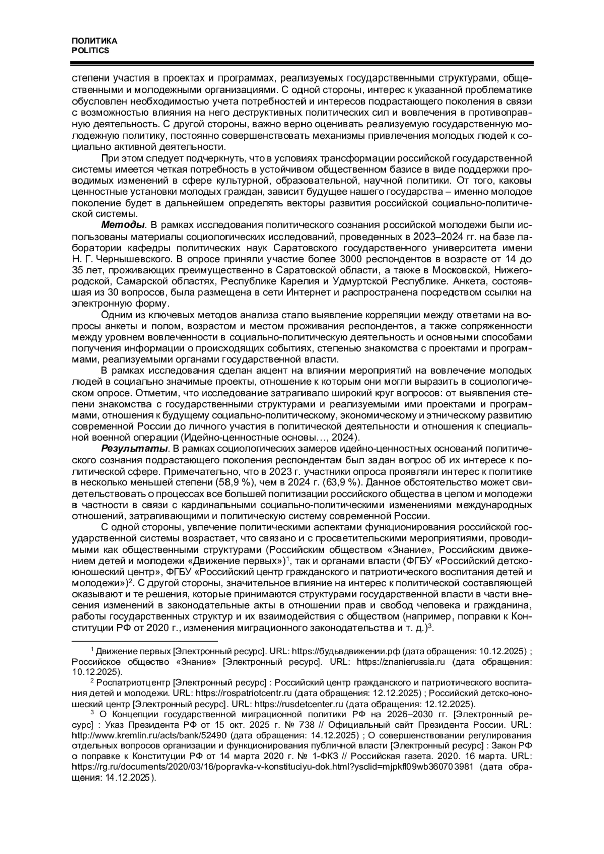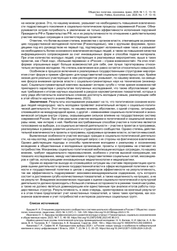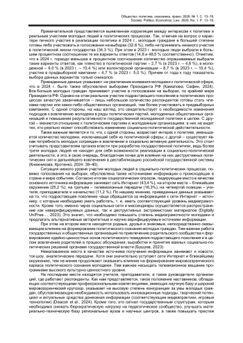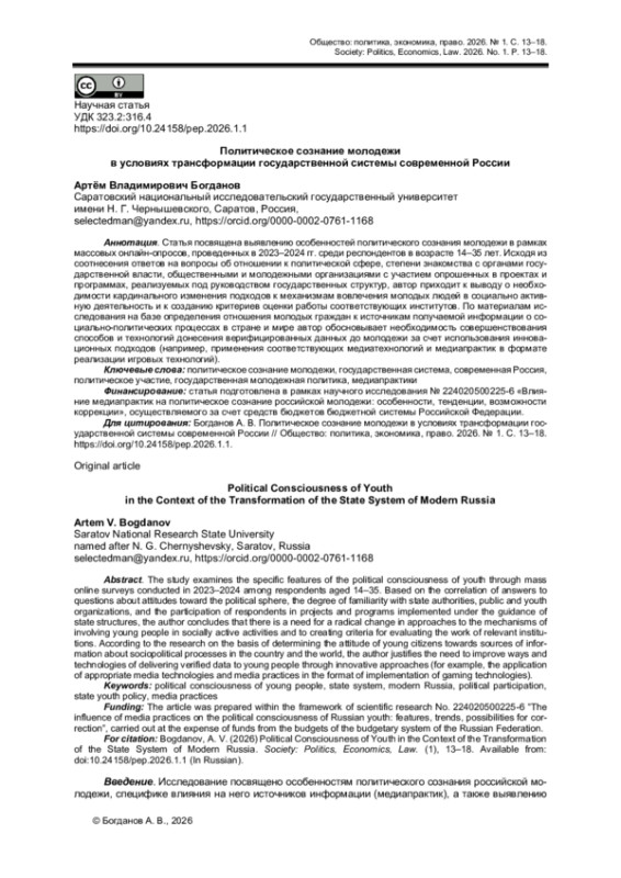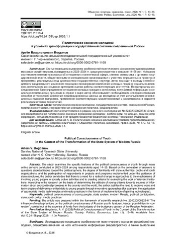 Статья посвящена выявлению особенностей политического сознания молодежи в рамках массовых онлайн-опросов, проведенных в 2023-2024 гг. среди респондентов в возрасте 14-35 лет. Исходя из соотнесения ответов на вопросы об отношении к политической сфере, степени знакомства с органами государственной власти, общественными и молодежными организациями с участием опрошенных в проектах и программах, реализуемых под руководством государственных структур, автор приходит к выводу о необходимости кардинального изменения подходов к механизмам вовлечения молодых людей в социально активную деятельность и к созданию критериев оценки работы соответствующих институтов. По материалам исследования на базе определения отношения молодых граждан к источникам получаемой информации о социально-политических процессах в стране и мире автор обосновывает необходимость совершенствования способов и технологий донесения верифицированных данных до молодежи за счет использования инновационных подходов (например, применения соответствующих медиатехнологий и медиапрактик в формате реализации игровых технологий).