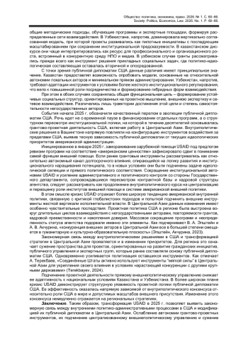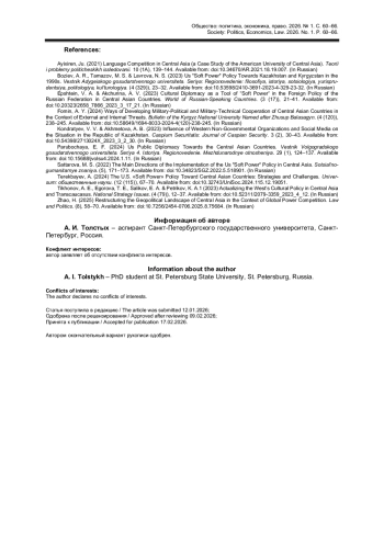 10. Terekbayev A. The U.S. “Soft Power” Policy Toward Central Asian Countries: Strategies and Challenges // Universum: общественные науки. 2024. № 12 (115). P. 67-70. DOI: 10.32743/UniSoc.2024.115.12.19051 EDN: LETTLS