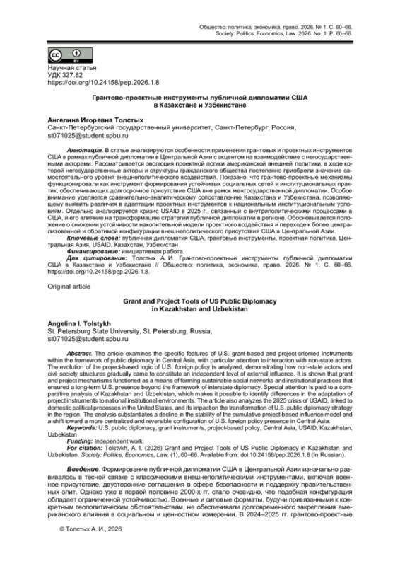 В статье анализируются особенности применения грантовых и проектных инструментов США в рамках публичной дипломатии в Центральной Азии с акцентом на взаимодействие с негосударственными акторами. Рассматривается эволюция проектной логики американской внешней политики, в ходе которой негосударственные акторы и структуры гражданского общества постепенно приобрели значение самостоятельного уровня внешнеполитического воздействия. Показано, что грантово-проектные механизмы функционировали как инструмент формирования устойчивых социальных сетей и институциональных практик, обеспечивающих долгосрочное присутствие США вне рамок межгосударственной дипломатии. Особое внимание уделяется сравнительно-аналитическому сопоставлению Казахстана и Узбекистана, позволяющему выявить различия в адаптации проектных инструментов к национальным институциональным условиям. Отдельно анализируется кризис USAID в 2025 г., связанный с внутриполитическими процессами в США, и его влияние на трансформацию стратегии публичной дипломатии в регионе. Обосновывается положение о снижении устойчивости накопительной модели проектного воздействия и переходе к более централизованной и обратимой конфигурации внешнеполитического присутствия США в Центральной Азии.