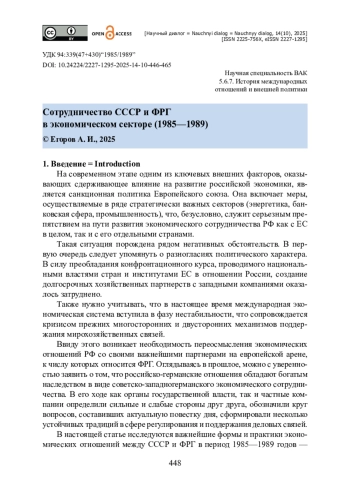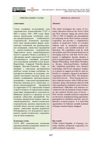 Статья посвящена исследованию хода экономического взаимодействия СССР и ФРГ в период 1985—1989 годов. Выявляются предпосылки углубления советско-западногерманского хозяйственного сотрудничества. Комплексно анализируются такие прогрессивные формы экономических отношений, как производственная кооперация, совместные предприятия и научно-техническое сотрудничество. Определяется вклад западногерманского малого и среднего бизнеса в развитие хозяйственных связей с партнерами из СССР. Устанавливается специфика регионального размещения компаний (земли БаденВюртемберг, Северный Рейн-Вестфалия, Бавария, Шлезвиг-Голштейн, Саар), завязавших с советскими предприятиями наиболее тесные деловые отношения. Акцентируется внимание на поддержке, оказанной земельными властями своим компаниям, развивавшим производственную кооперацию с советскими предприятиями. Показана динамика роста совместных советско-западногерманских предприятий на территории СССР, определены позиции сторон по вопросу об определении главных отраслевых направлений их деятельности. Выявлены трудности и преграды на пути развития совместных предприятий. Рассмотрены приоритетные формы советско-западногерманского научно-технического сотрудничества, включая лицензионно-патентный обмен, участие в выставках и ярмарках, совместные научные разработки. Подчеркивается, что возможности двустороннего научно-технического сотрудничества не были исчерпаны.