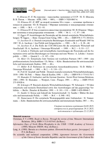 17. Müller R.-D. Reformen im sowjetischen Aussenhandelssystems / R.-D. Müller // Osteuropa-Wirtschaft. - 1988. - № 2. - S. 110-121.