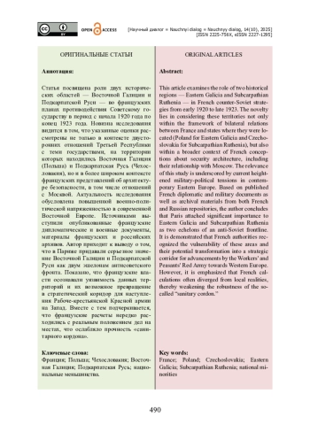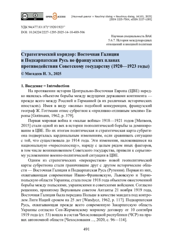 Статья посвящена роли двух исторических областей — Восточной Галиции и Подкарпатской Руси — во французских планах противодействия Советскому государству в период с начала 1920 года по конец 1923 года. Новизна исследования видится в том, что указанные оценки рассмотрены не только в контексте двусторонних отношений Третьей Республики с теми государствами, на территории которых находились Восточная Галиция (Польша) и Подкарпатская Русь (Чехословакия), но и в более широком контексте французских представлений об архитектуре безопасности, в том числе отношений с Москвой. Актуальность исследования обусловлена повышенной военно-политической напряженностью в современной Восточной Европе. Источниками выступили опубликованные французские дипломатические и военные документы, материалы французских и российских архивов. Автор приходит к выводу о том, что в Париже придавали серьезное значение Восточной Галиции и Подкарпатской Руси как двум эшелонам антисоветского фронта. Показано, что французские власти осознавали уязвимость данных территорий и их возможное превращение в стратегический коридор для наступления Рабоче-крестьянской Красной армии на Запад. Вместе с тем подчеркивается, что французские расчеты нередко расходились с реальным положением дел на местах, что ослабляло прочность «санитарного кордона».
