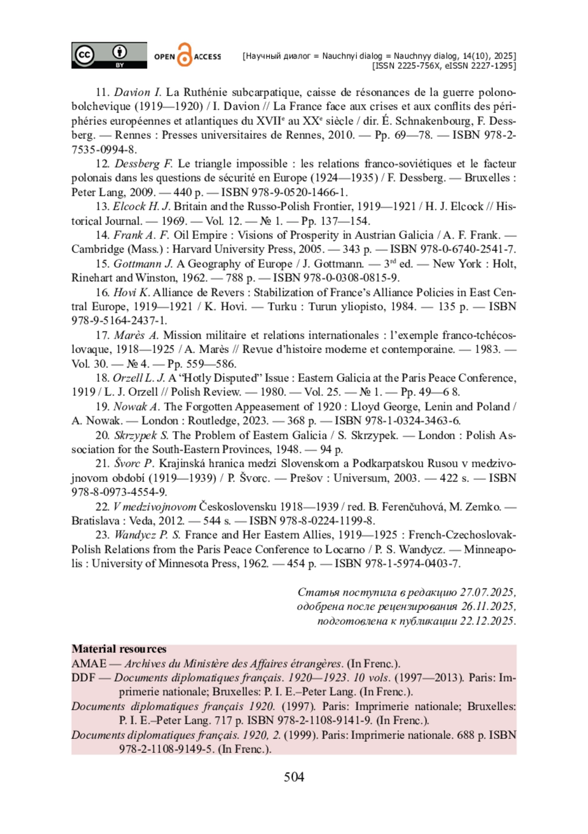 17. Marès A. Mission militaire et relations internationales : l’exemple franco-tchécoslovaque, 1918-1925 / A. Marès // Revue d’histoire moderne et contemporaine. - 1983. - Vol. 30. - № 4. - Pp. 559-586.
