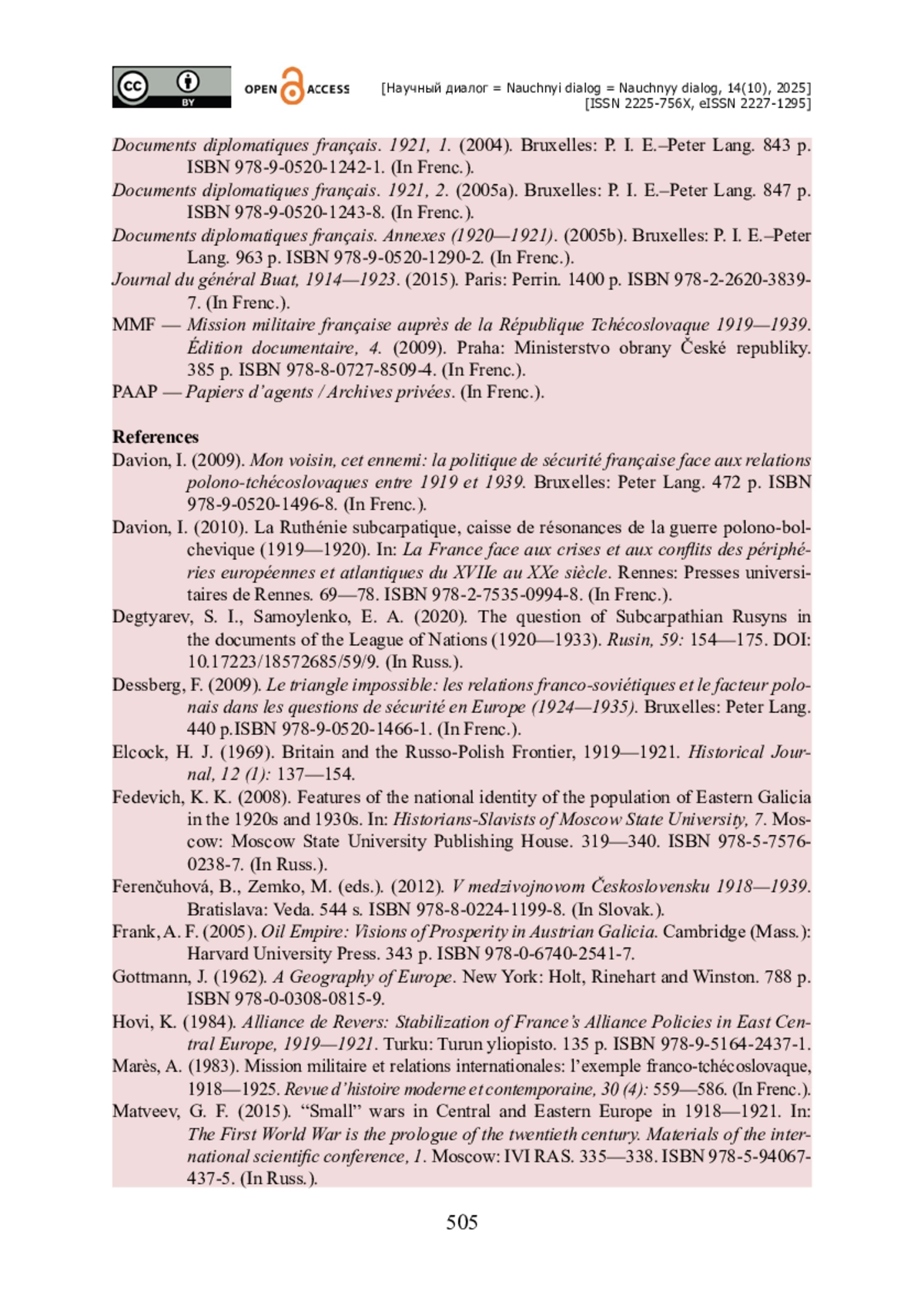 11. Davion I. La Ruthénie subcarpatique, caisse de résonances de la guerre polonobolchevique (1919-1920) / I. Davion // La France face aux crises et aux conflits des périphéries européennes et atlantiques du XVIIe au XXe siècle / dir. É. Schnakenbourg, F. Dessberg. - Rennes : Presses universitaires de Rennes, 2010. - Pp. 69-78. - ISBN 978-2-7535-0994-8.