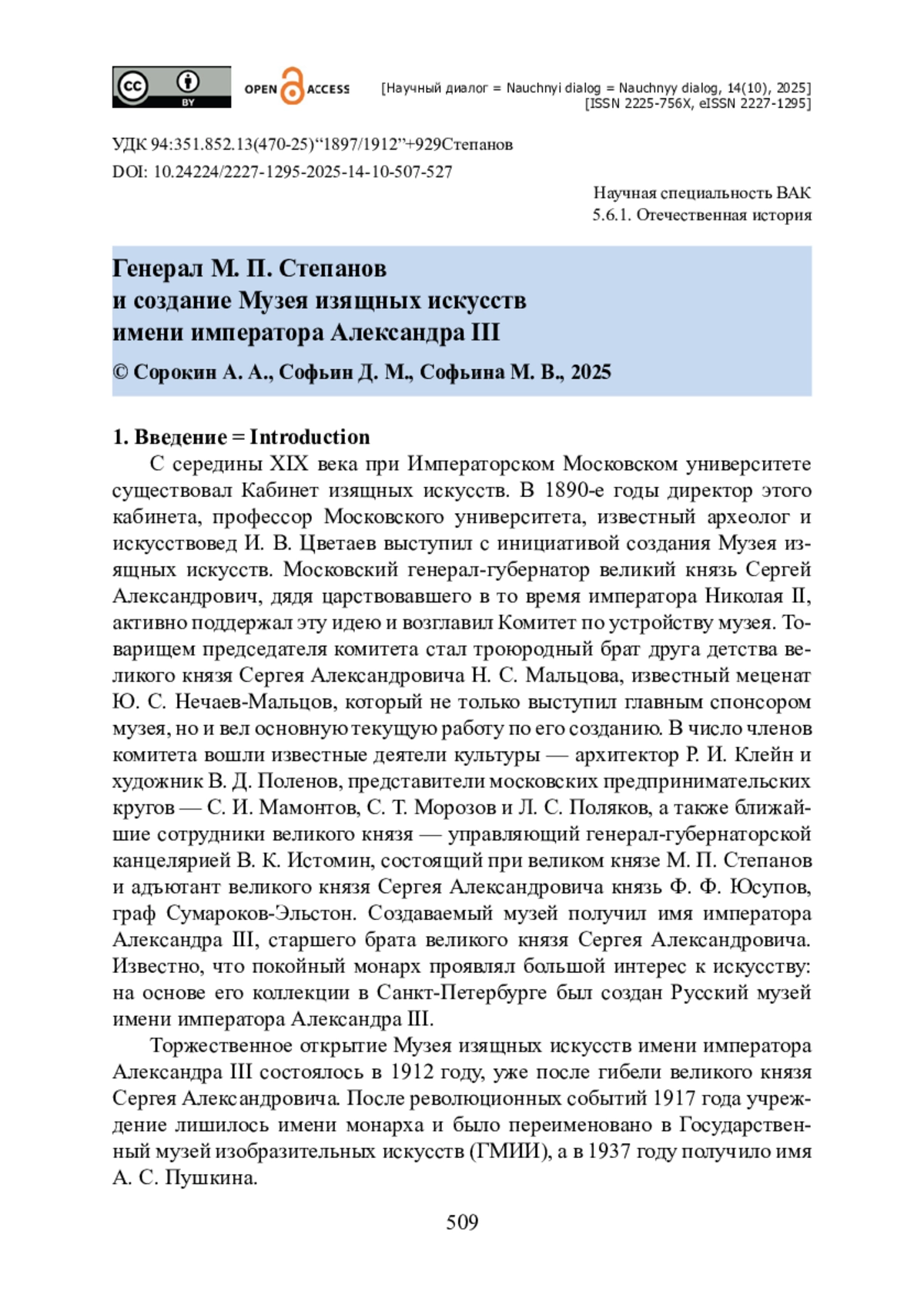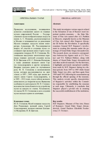Проведено исследование, посвященное аспектам становления одного из главных музеев современной России — Государственного музея изобразительных искусств имени А. С. Пушкина, располагающегося в Москве и называвшегося до революции Музеем изящных искусств имени императора Александра III. Рассматривается вопрос об участии в создании музея состоявшего при великом князе Сергее Александровиче генерала М. П. Степанова. Источниками выступили многотомная переписка главных деятелей создания музея, И. В. Цветаева и Ю. С. Нечаева-Мальцова, а также дневники великого князя Сергея Александровича и другие материалы. Впервые показана ранее не изучавшаяся роль М. П. Степанова в возникновении музея, которая рассматривается на двух этапах: в 1897—1905 годы, при жизни великого князя Сергея Александровича, и в 1905—1912 годах, после гибели великого князя вплоть до открытия музея. Выявлены особенности деятельности М. П. Степанова в качестве члена Комитета по устройству музея на каждом из этапов. Установлено, что вклад М. П. Степанова в дело создания музея оказался одним из ключевых.